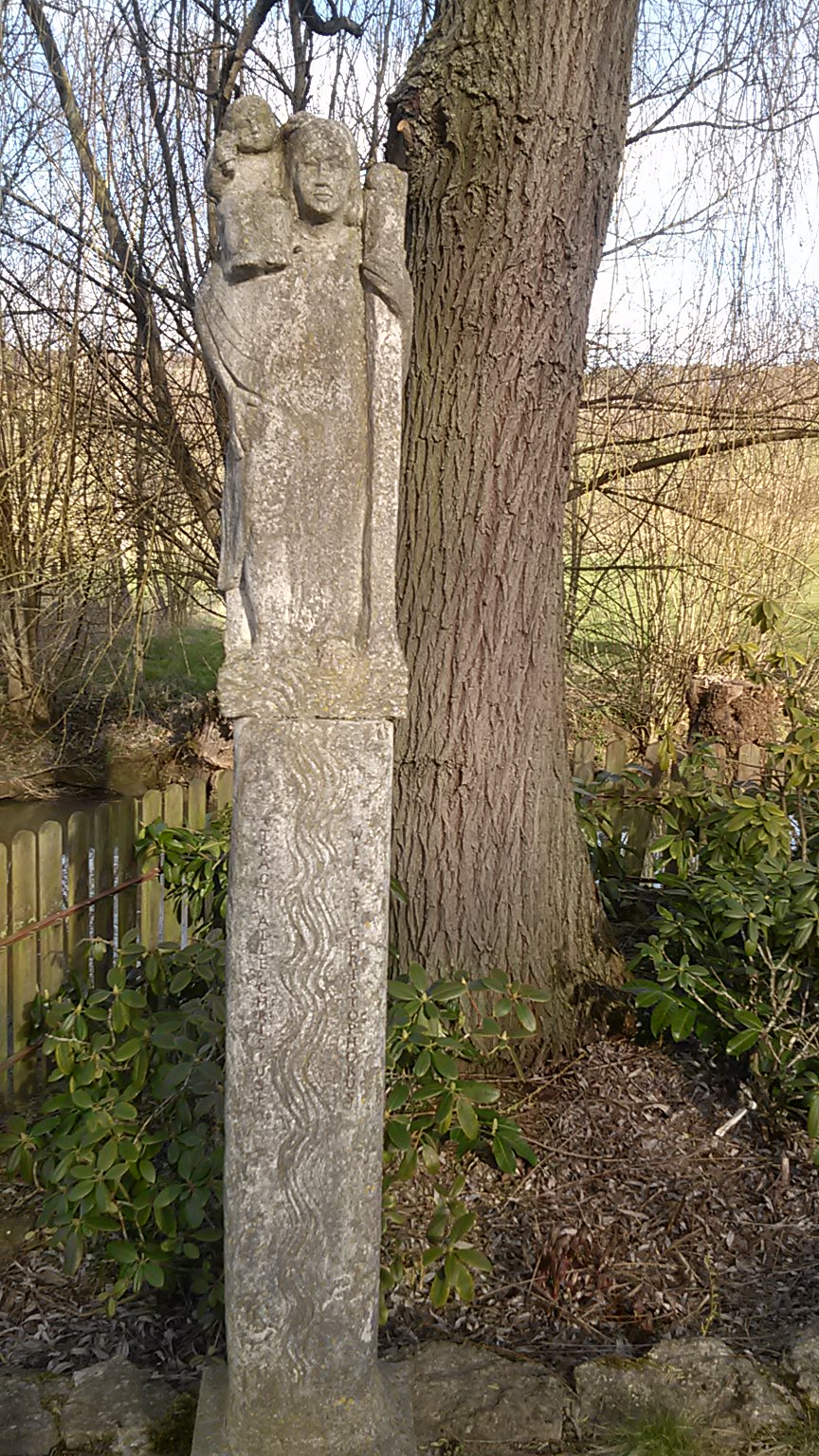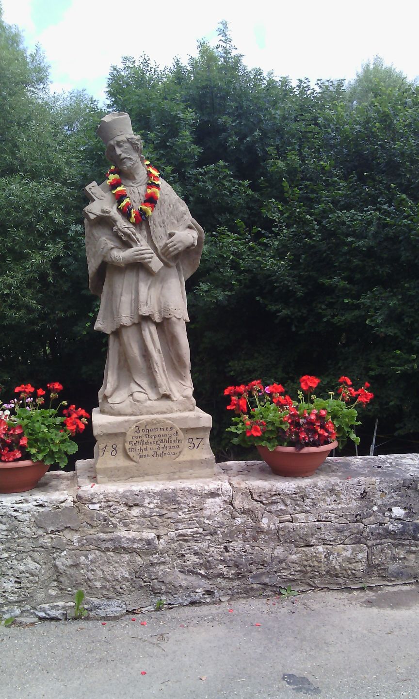 Außerdem steht am Ortseingang auf der sehenswerten Brücke eine wunderschöne „Nepomuk-Statue“. Wie Sie auf dem Bild sehen, war der Hl. Nepomuk 2015 Fußballfan und unterstützte sogar unsere Weltmeisterelf!!