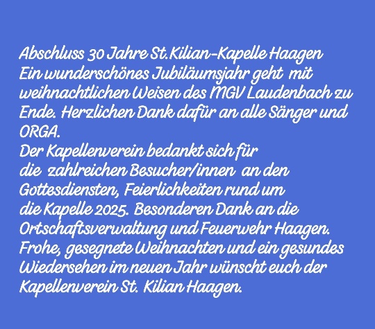 Abschluss 30 Jahre St. Kilian-Kapelle Haagen von Manja Gromes · 24. Dezember 2025 Quelle und Bilder: Brigitte Wolfert