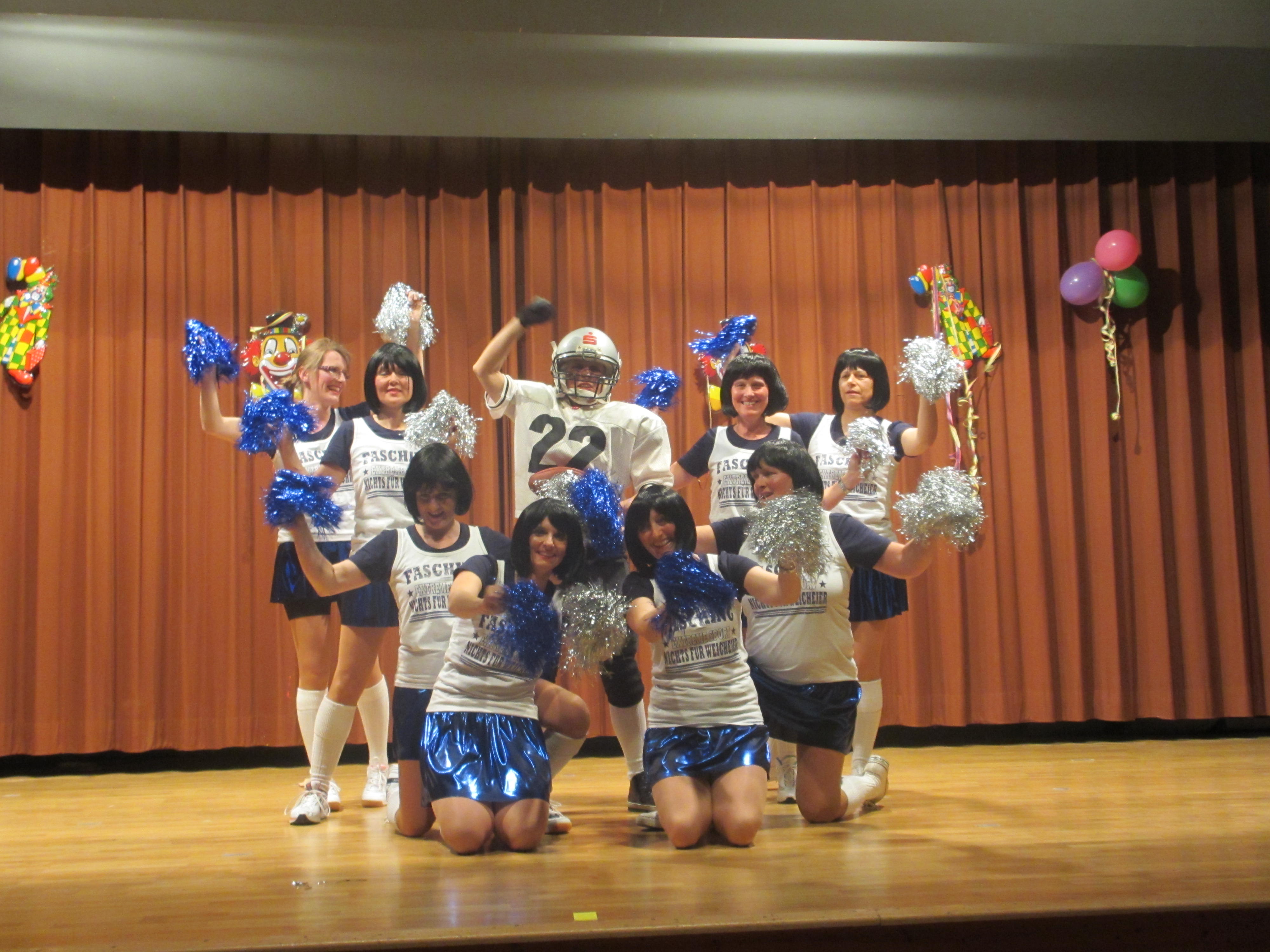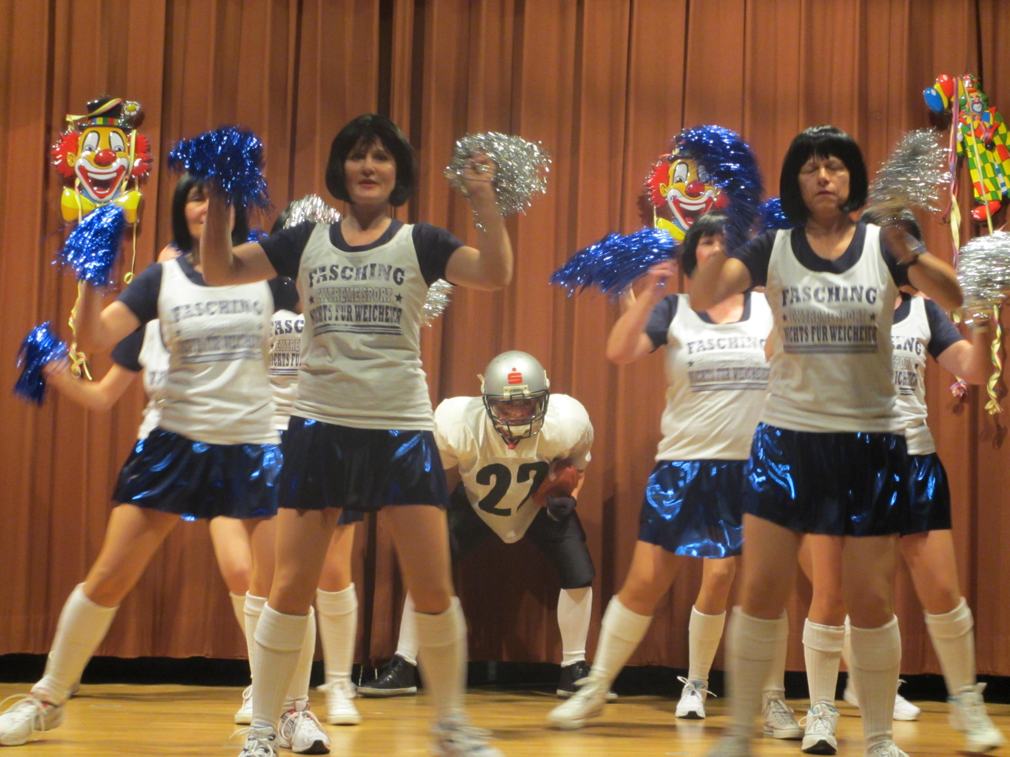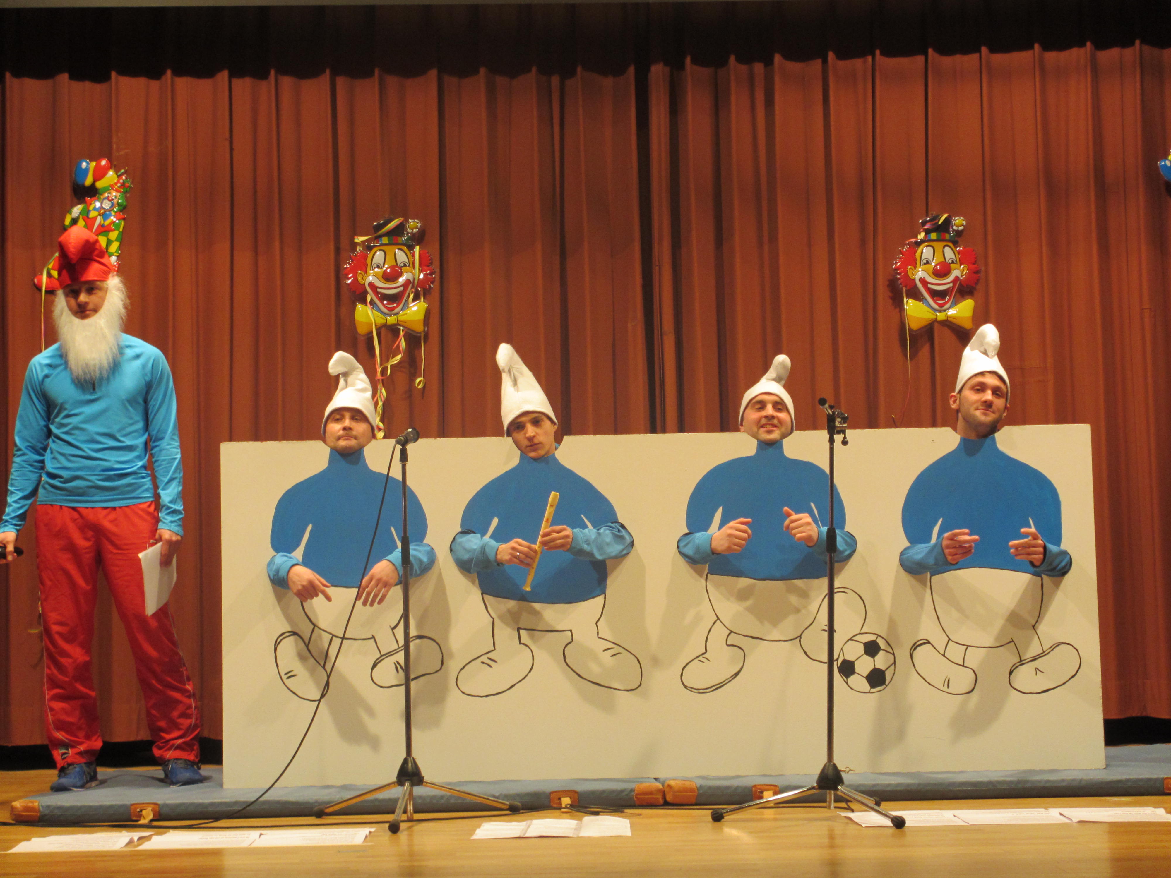 Ein Augenschmaus war dann der Auftritt der Gardetanzgruppe Schnockettis aus Königshofen, die mit Power das Narrenvolk zu Standing Ovations brachten und mit der verdienten Zugabe tänzerische Höchstleistung zeigten. Nach diesem Auftritt hatten es die TSV-Damen als CheerLeaders nicht ganz einfach. Aber auch Sie brachten durch Ihr passendes Outfit, viel Routine und etwas Sex die Halle zum Kochen. Sollte der TSV Laudenbach in diesem Jahr aufsteigen, werden Sie auf jeden Fall noch einmal dabei sein. Gespannt war man nun auf den Auftritt der TSV-Aktiven. Mit der Melodie der Schlümpfe schafften es auch sie, das Publikum in ihren Bann zu ziehen und überzeugten sowohl inhaltlich mit viel Witz als auch musikalisch.