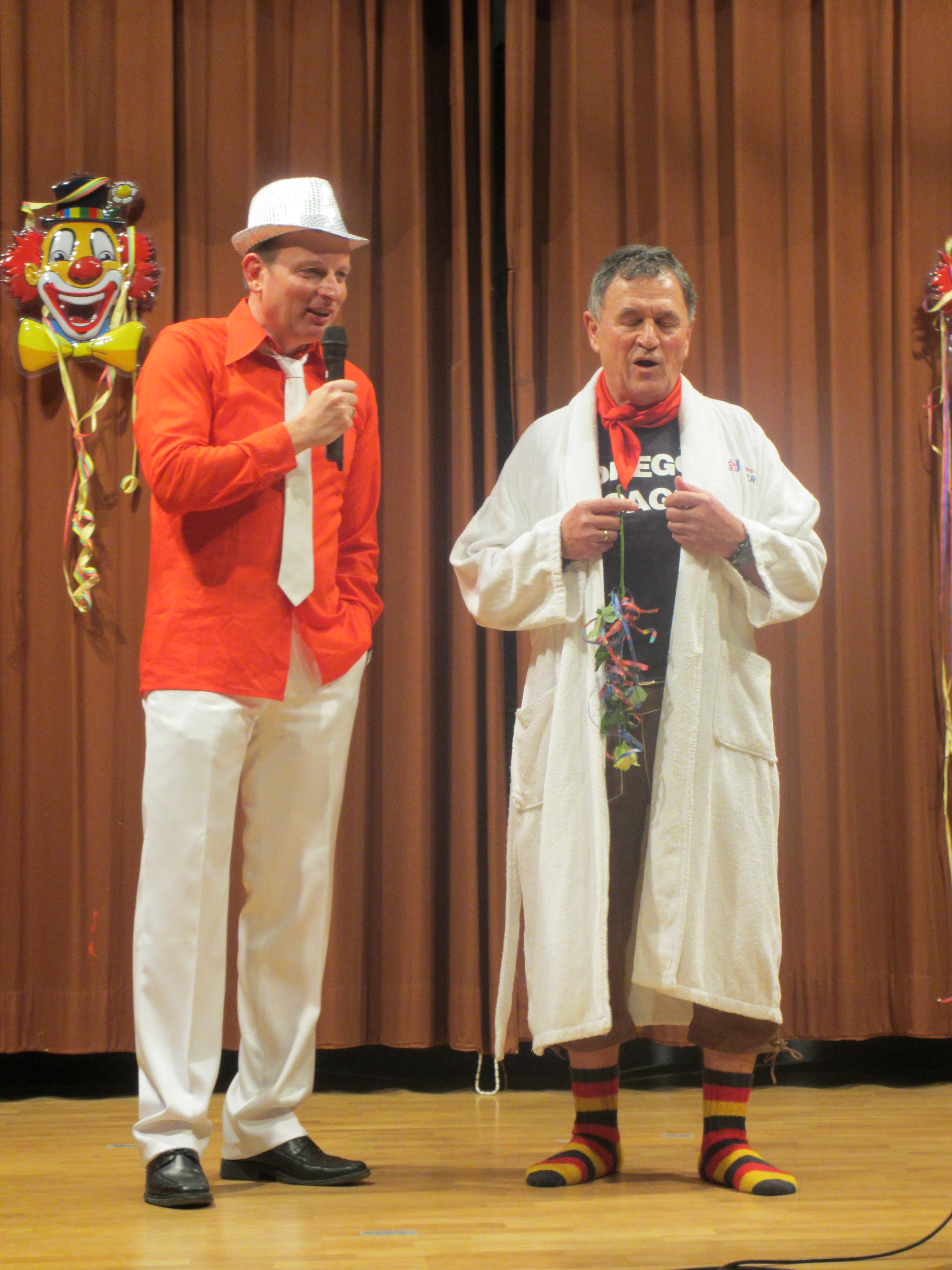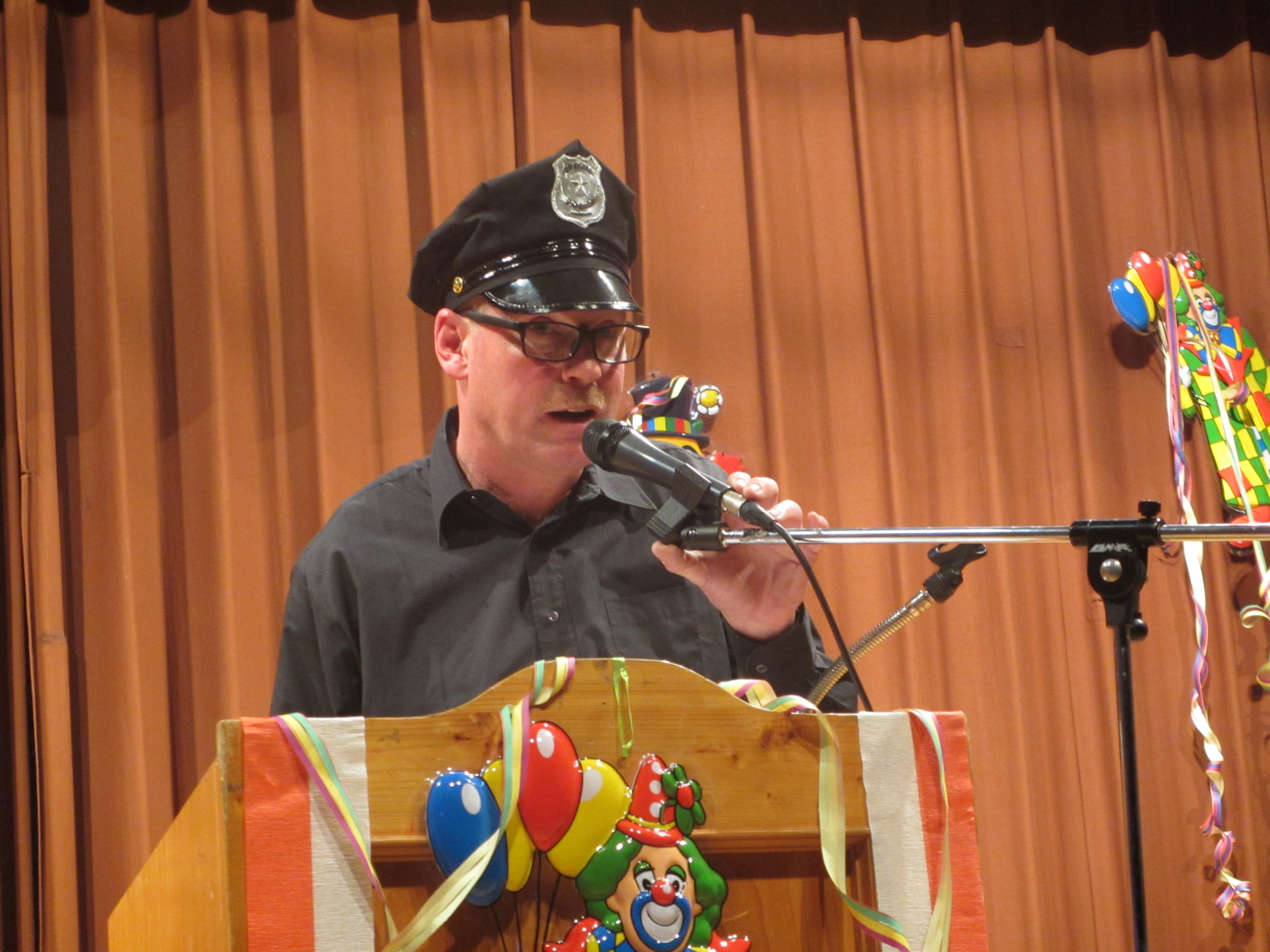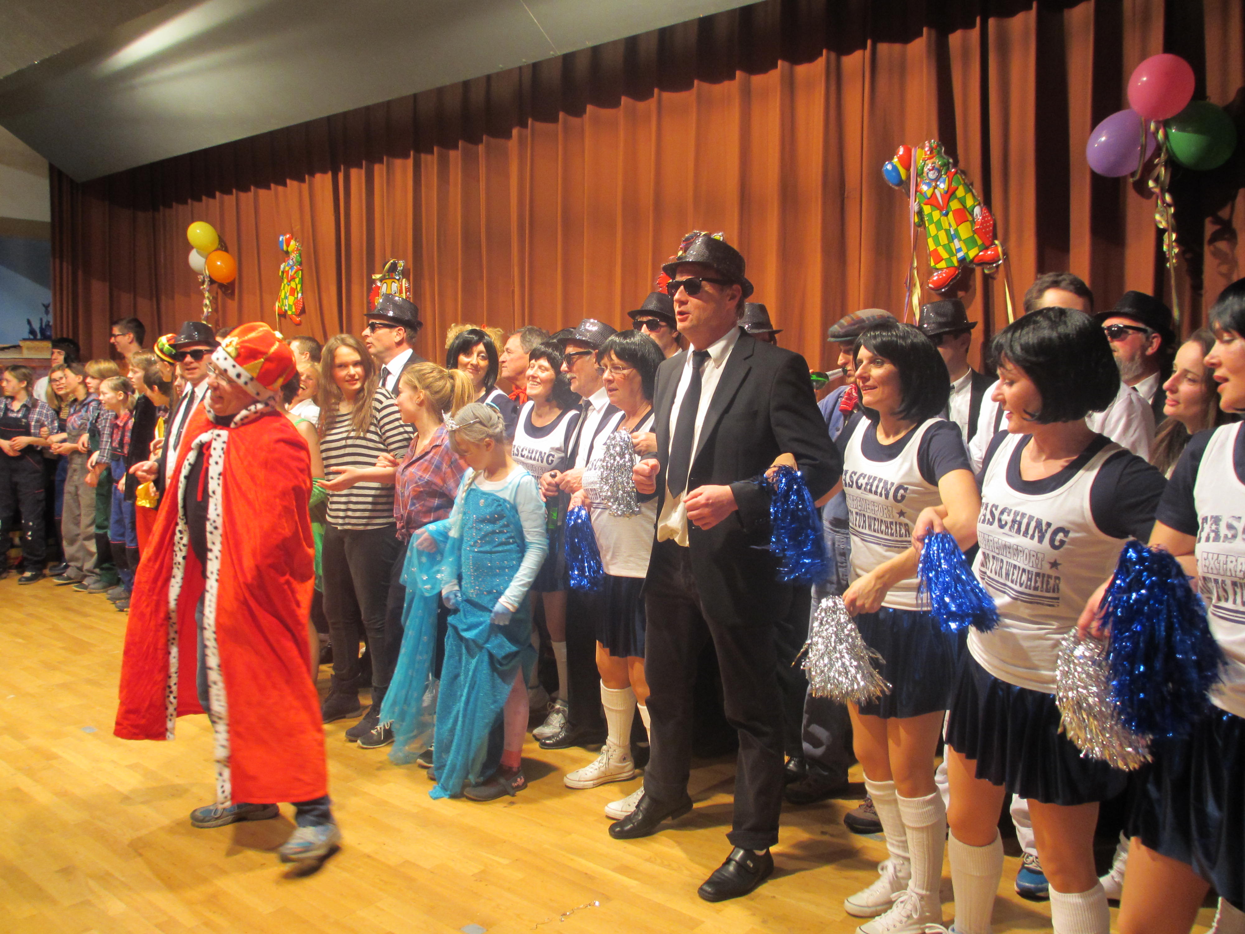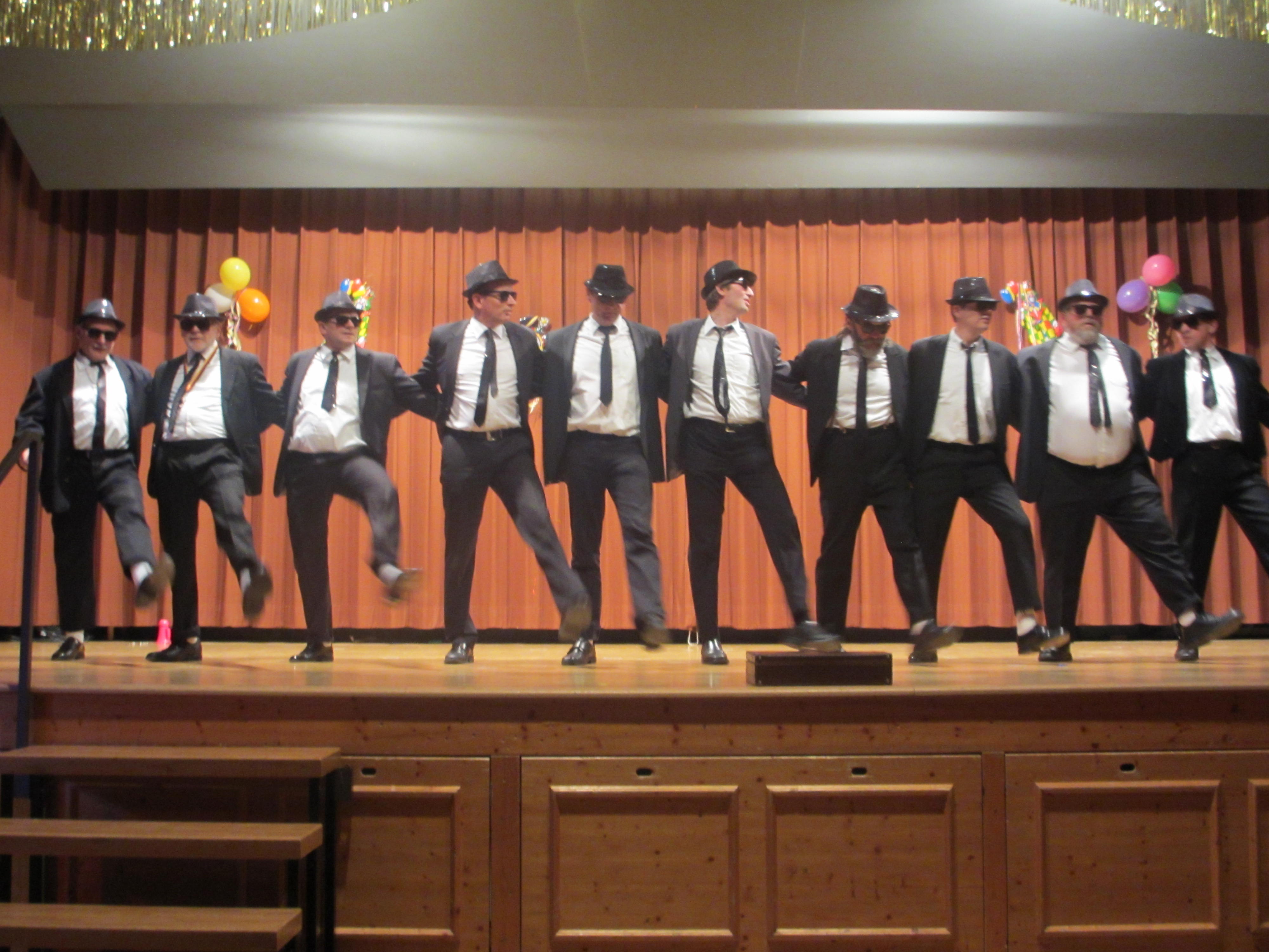 Mit Klaus Mangold, dem „Mann vom Berg“ als Dorfpolizist, gab ein weiteres Büttenass des TSV sein Bestes. Vieles galt es aus der örtlichen Szene, die Werbung für den MGV, der KKC Ausflug, die Geschehnisse der letzten Silvesterparty oder auch die aktuelle Situation der Fußballabteilung zu berichten. Er ließ kein Fettnäpfchen aus und hatte die Lacher immer auf seiner Seite. Die TSV-Mädels sind seit vielen Jahren immer mit dabei. Mit „Dancing in the Dark“ verstanden Sie es mit ihrer Schwarzlichtshow das Publikum zu begeistern und die Phantasie anzuregen. Wie in jedem Jahr ist die TSV-Männergruppe am Ende einer der Höhepunkte der Veranstaltung. Ihr Auftritt als die „Blues Brothers“ zeigte, dass mit guter Musik, passender Kleidung und tänzerischem Können auch die Männer unter der Leitung von Christina Mayser Bestleistungen vollbringen können.