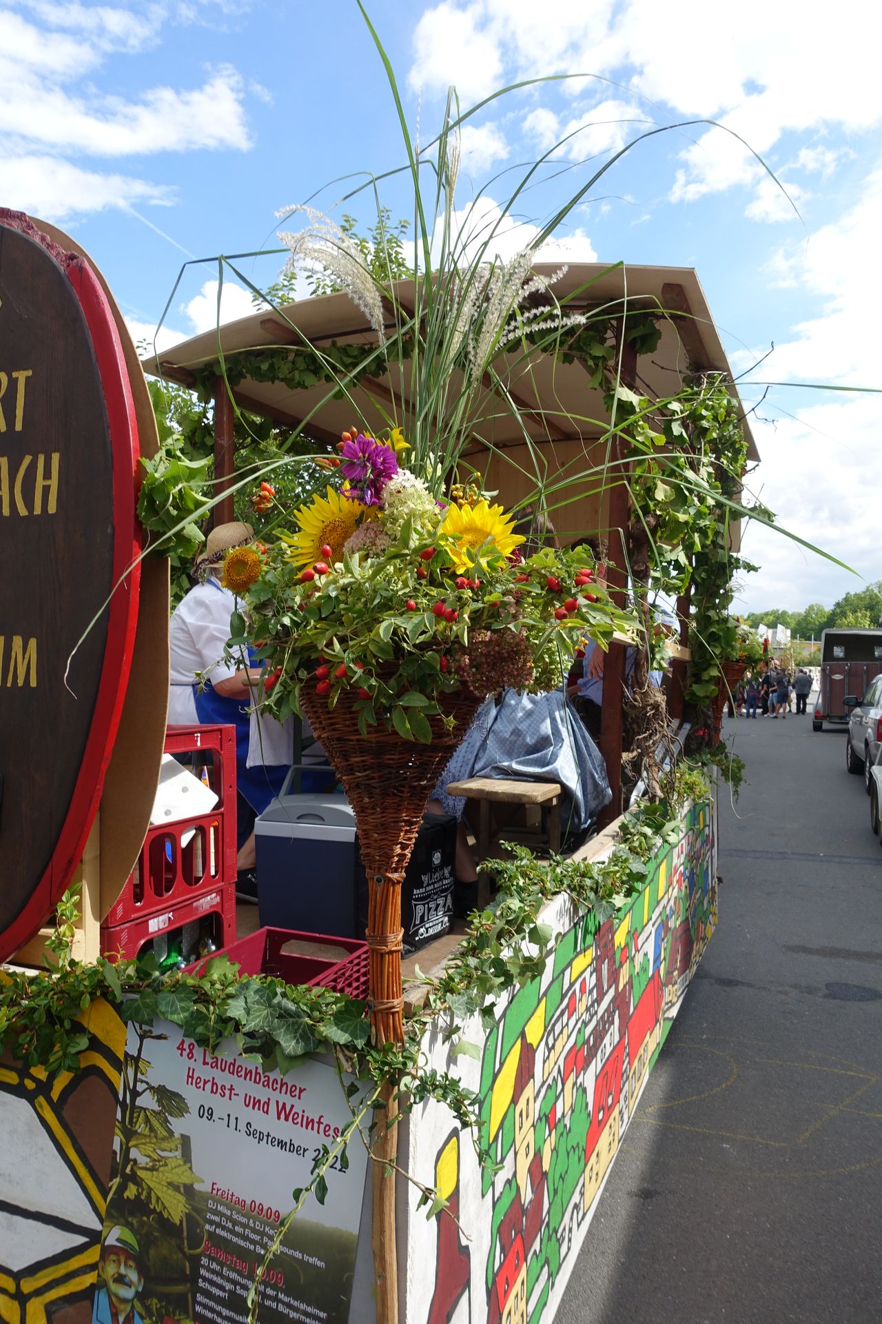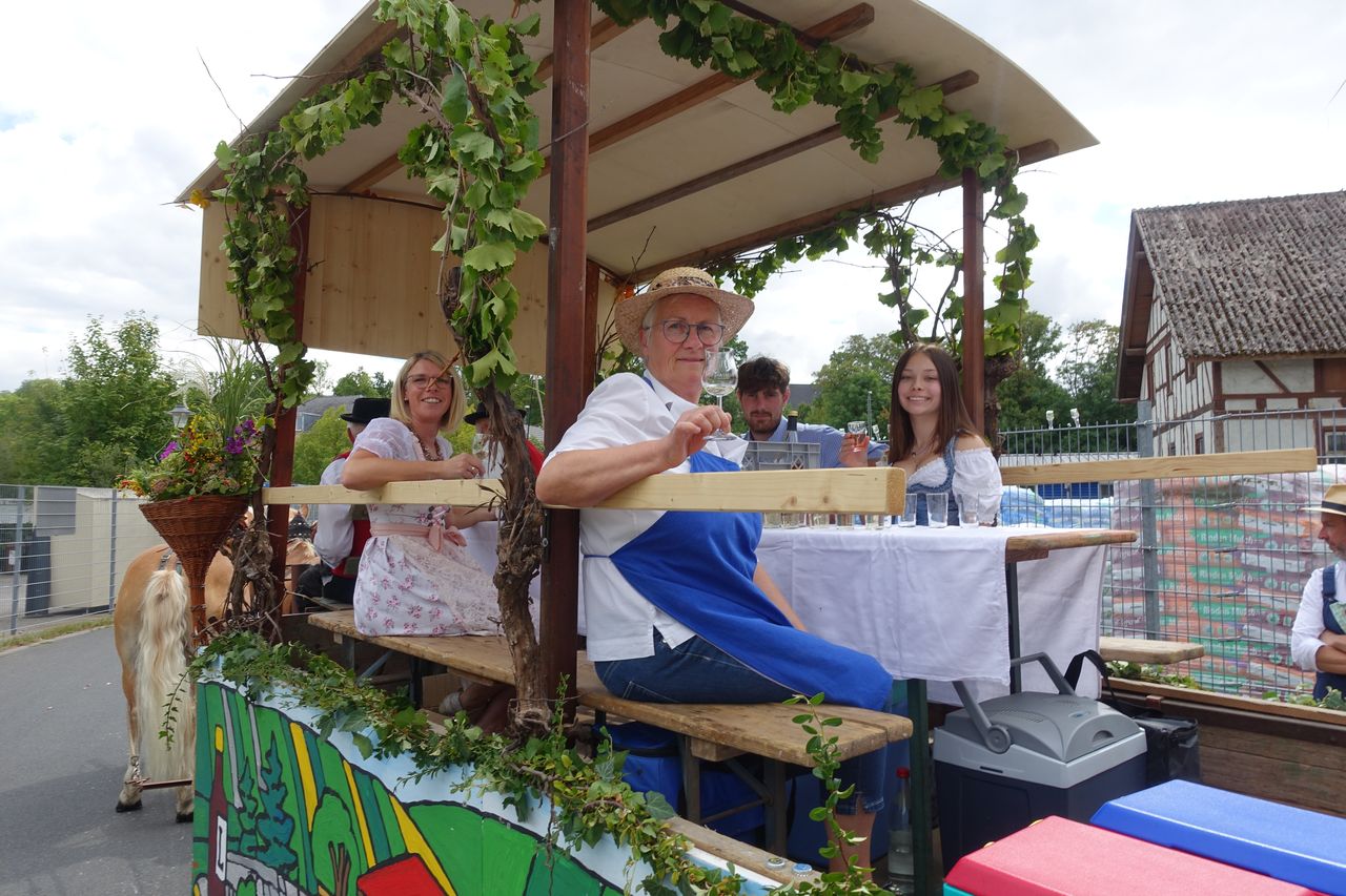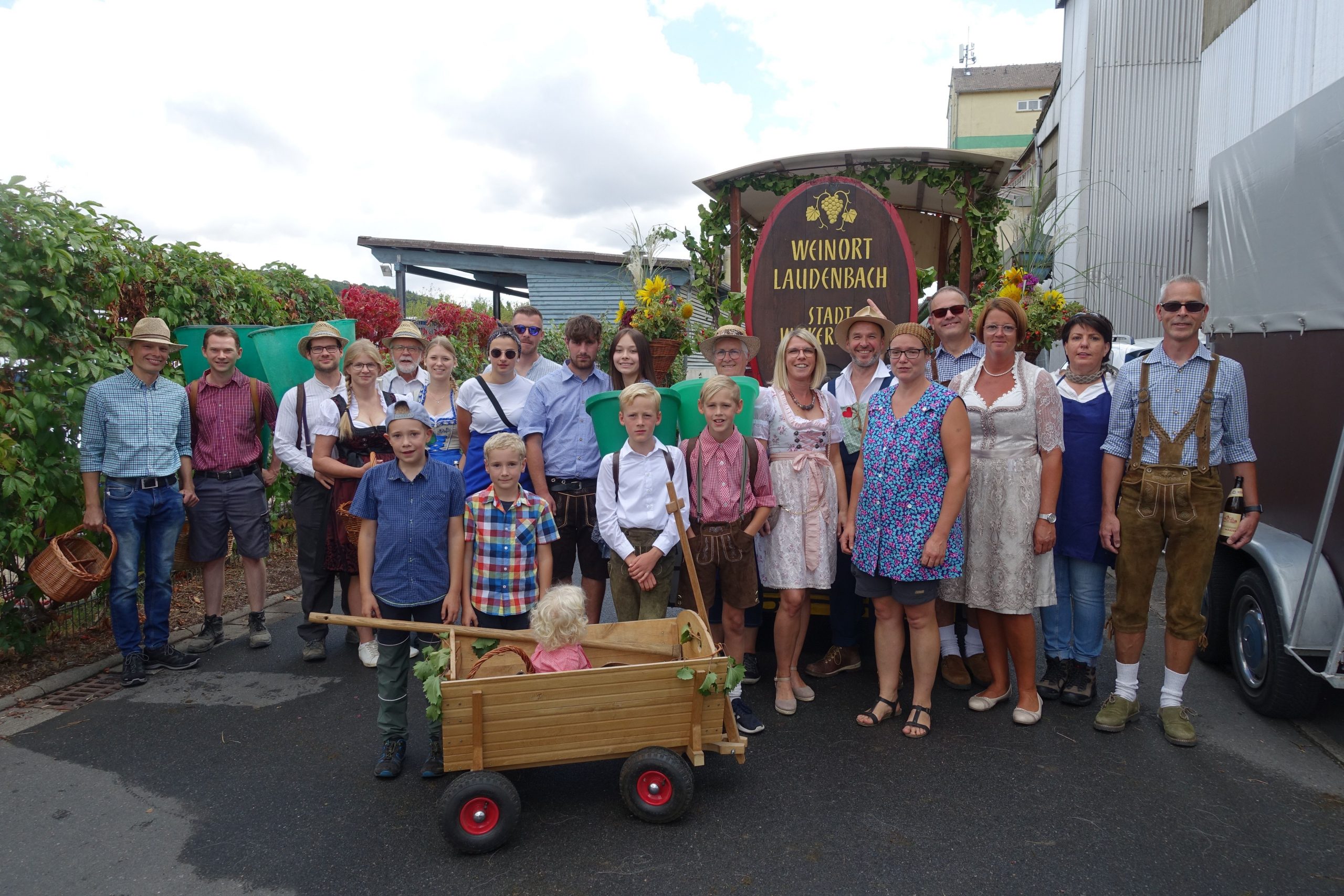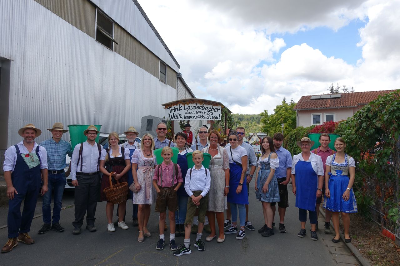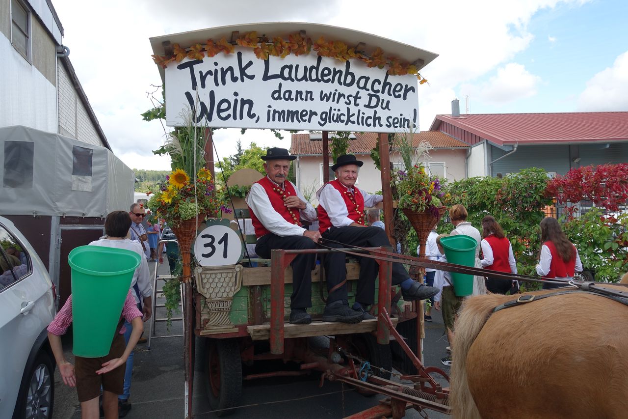 Mit einer stattlichen Gruppe und einem festlich geschmückten Festwagen nahmen zahlreiche Laudenbacher Bürger, Winzer, Ortschaftsräte mit Familien sowie Freunde und Bekannte am Kärwe-Umzug in Weikersche teil. Viel Freude herrschte bei den Teilnehmern am Historischen Umzug am Kärwe-Sonntag und die gute Laune und der Wein, der ausgeschenkt wurde, kam bei den Zuschauern sehr gut an. Ein „herzliches Danke“ an alle die dabei waren, vor allem auch den Helfern zum Schmücken und Vorbereiten des wunderschönen Festwagens.