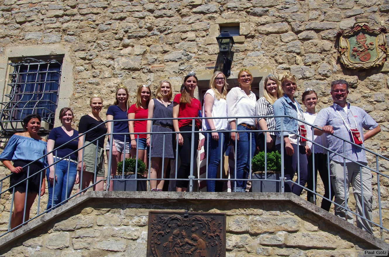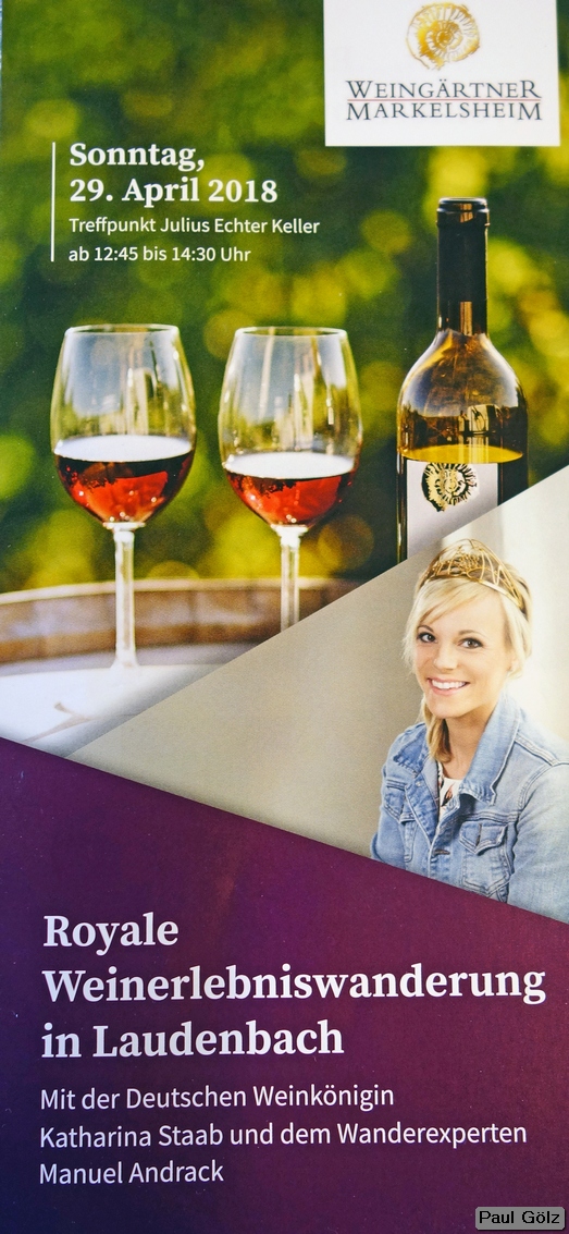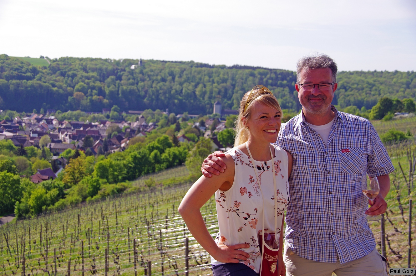 Die Markelsheimer Weinkönigin Ann-Kathrin Schmitt und Weikersheims Bürgermeister Klaus Kornberger bereiteten der königlichen Hoheit einen würdigen Empfang. Anlass des Besuchs: seit zwölf Jahren veranstalten die Laudenbacher Winzer gemeinsam mit der Weingärtner Markelsheim eG die Laudenbacher Weinerlebniswanderung. Bundesweit fanden am vergangenen Wochenende rund 130 geführte Weinerlebniswanderungen unter dem Motto „Wein, Natur und Kultur“ statt. Im zwölften Jahr gab es jetzt eine ganz besondere für Laudenbach. Denn neben der Deutschen Weinkönigin war auch der Wanderbuchautor Manuel Andrack mit dabei. Die Tour war eine der beiden royalen Weinwanderungen, die anlässlich des zehnjährigen Bestehens des Weinwanderwochenendes 2018 vom Deutschen Weininstitut per Los vergeben wurden.