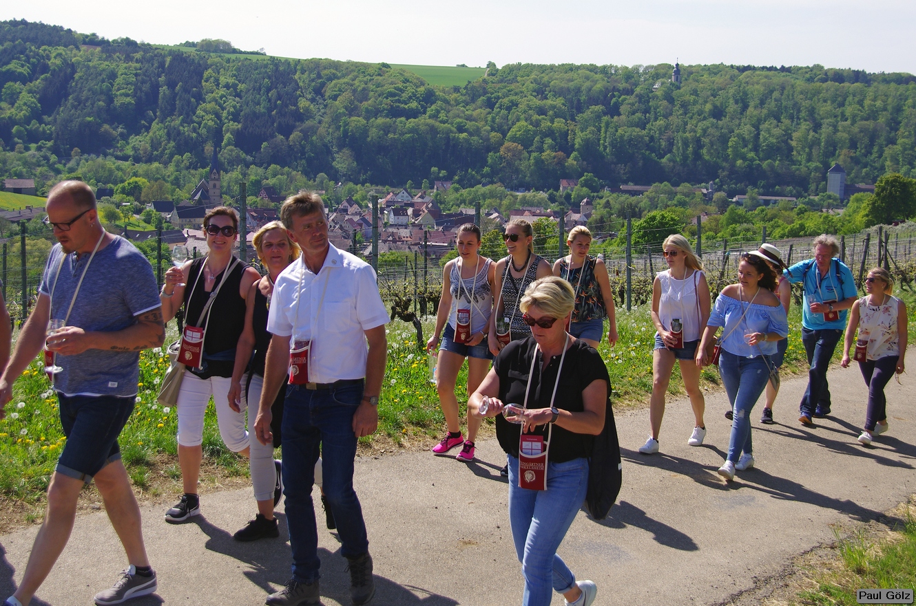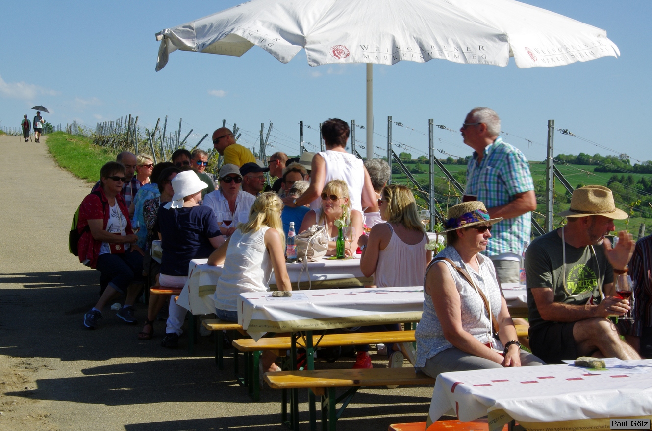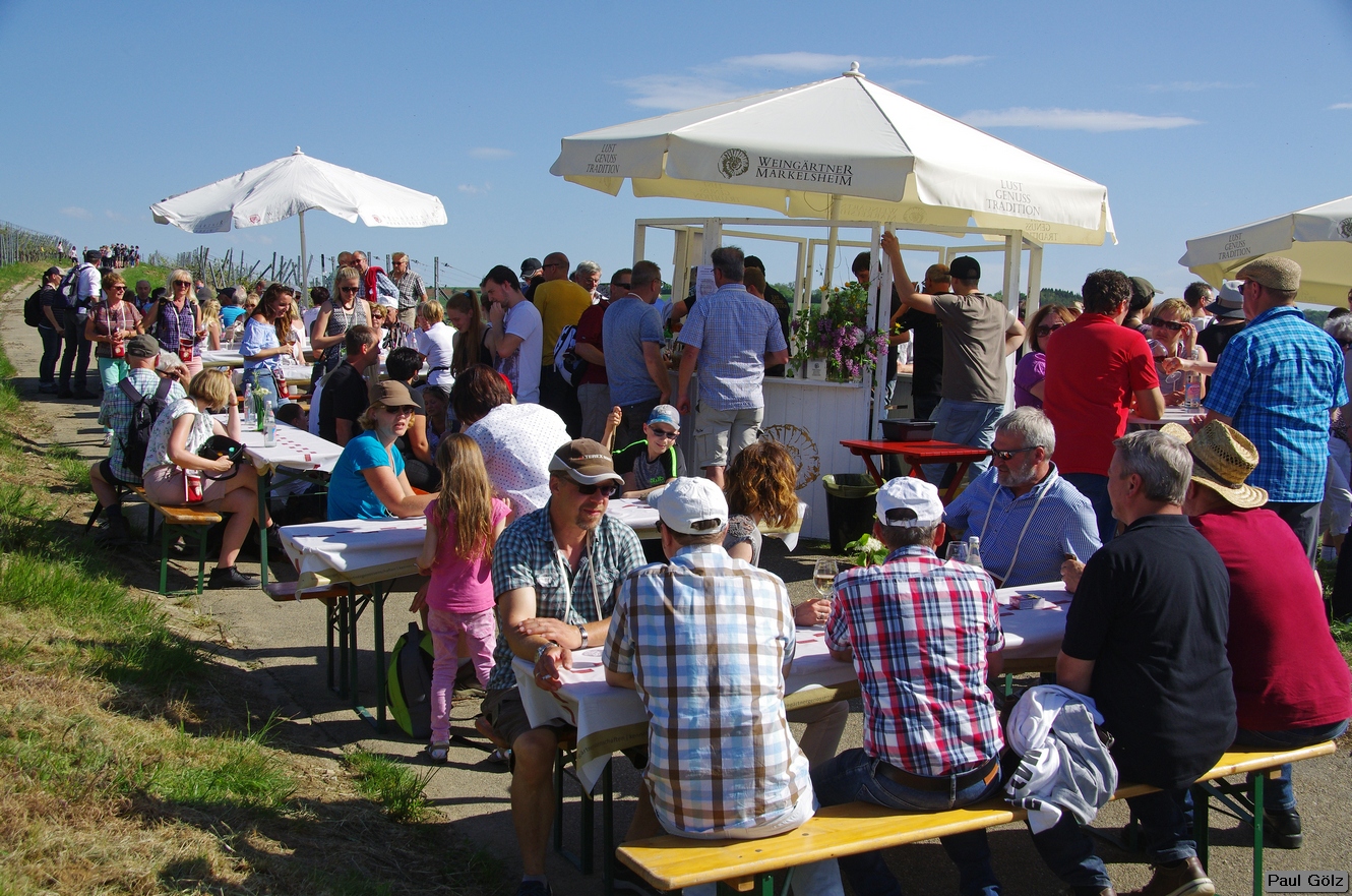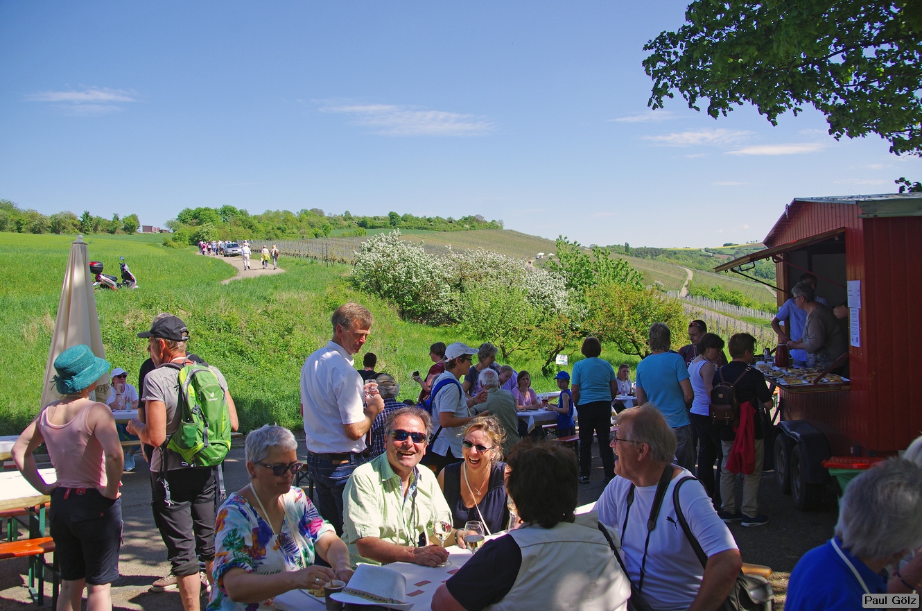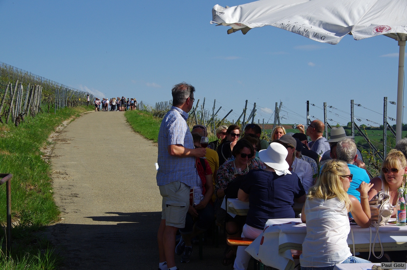 Dabei erfuhren die Gäste Interessantes über die Weinbaugeschichte von Laudenbach, die verschiedenen Rebsorten (auch wie man sie erkennt) und die Arbeiten im Laufe eines Jahres wie Rebschnitt, Anbinden oder Schädlingsbekämpfung. Geschäftsführender Vorstand Michael Schmitt von der WG Markelsheim ergänzte, dass ein Hektar aus rund 4500 Rebstöcken besteht und ein Rebstock wiederum etwa drei Flaschen à 0,75 l Wein hervorbringt. An drei Ständen wurden unter großen Sonnenschirmen heimische Weine der WG Markelsheim angeboten. Jeder Teilnehmer konnte unter dem Werbeslogan „Von der Sonne verwöhnt“ bei sommerlichen Temperaturen auf der Runde die typischen Weine inmitten der herrlichen Natur genießen. Zum Abschluss der Wanderung stärkten sich die doch etwas erschöpften Wanderer mit einer Winzervesper im Schlosshof oder im angrenzenden urigen Julius-Echter-Keller. Bereits am Vormittag fand die offizielle Begrüßung und der Eintrag ins Goldene Buch der Stadt Weikersheim der beiden renommierten Ehrengäste im Julius-Echter-Tank statt.