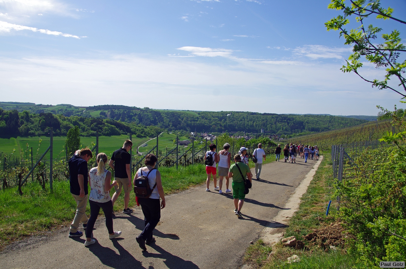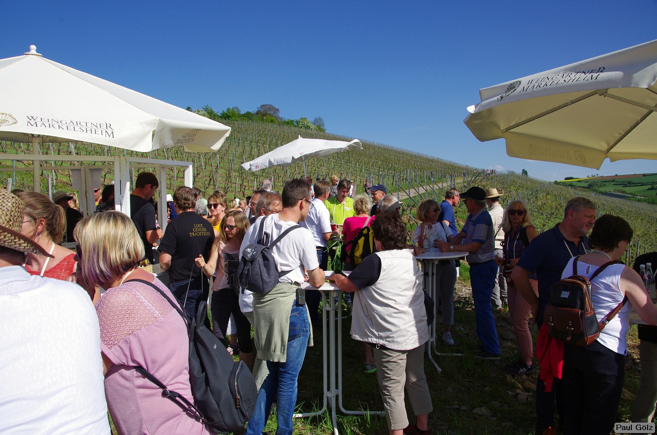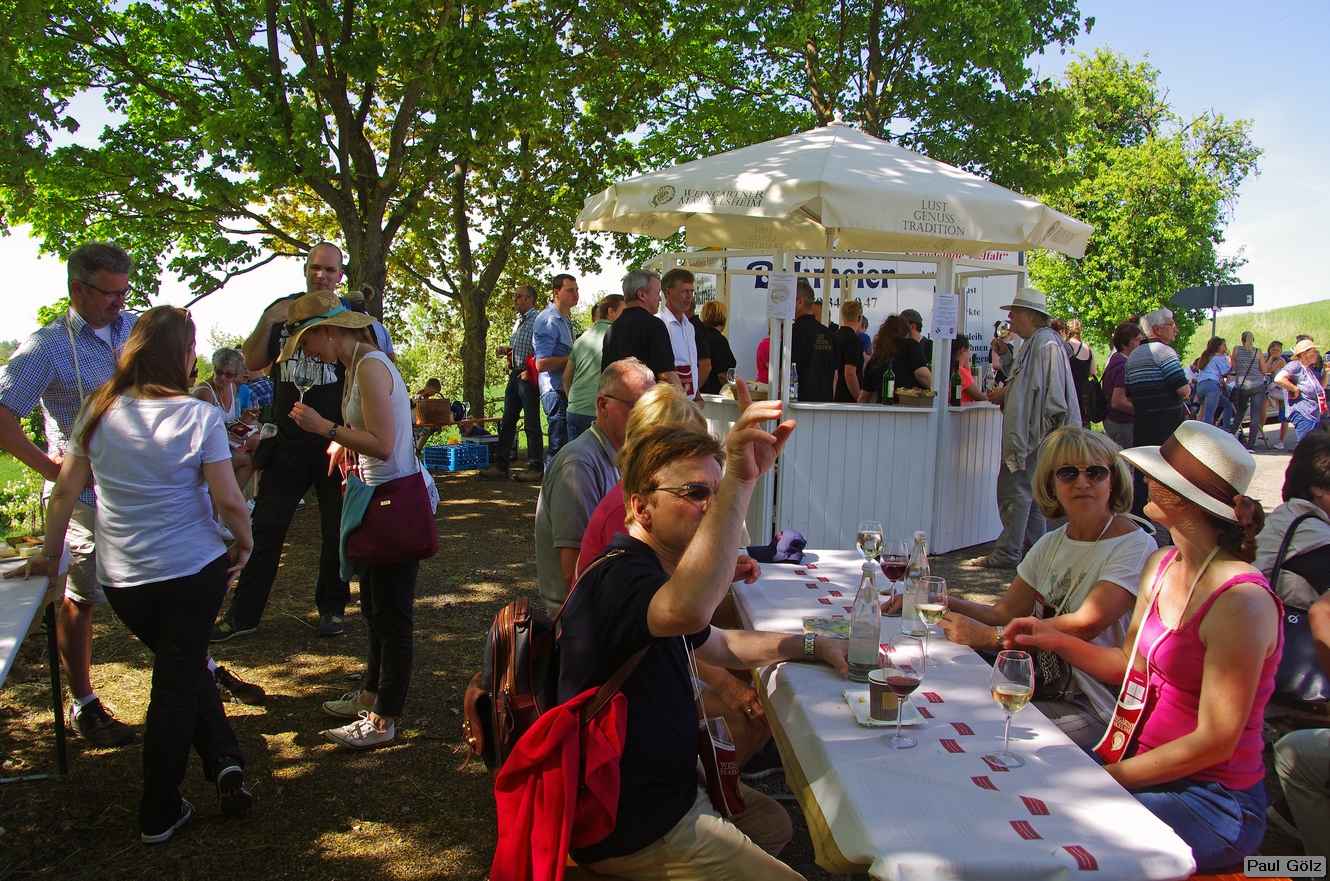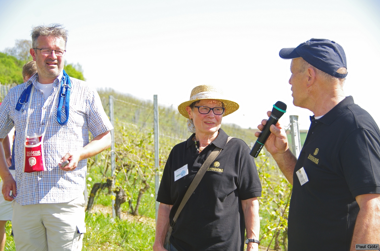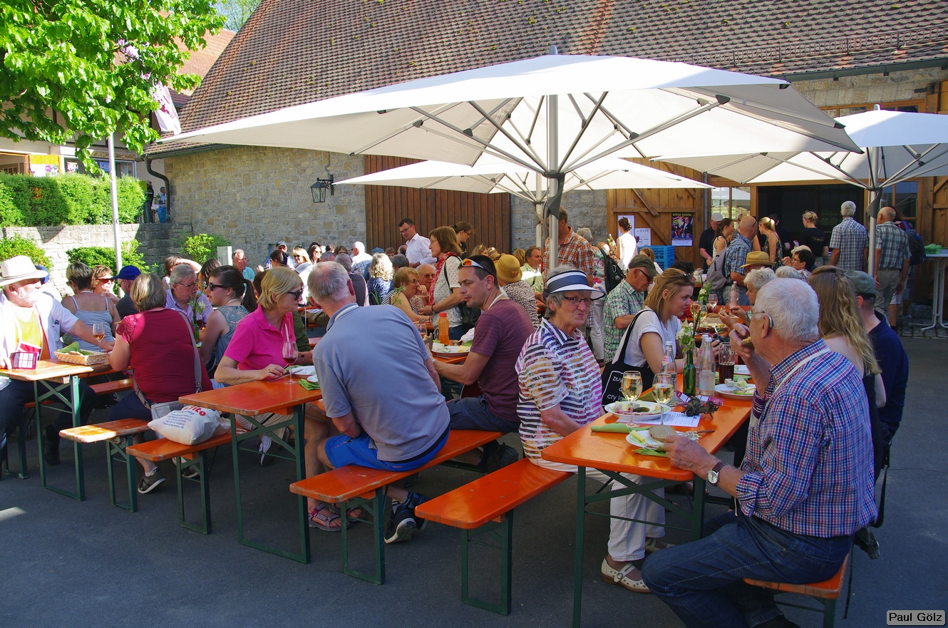 Dabei erfuhren die Gäste Interessantes über die Weinbaugeschichte von Laudenbach, die verschiedenen Rebsorten (auch wie man sie erkennt) und die Arbeiten im Laufe eines Jahres wie Rebschnitt, Anbinden oder Schädlingsbekämpfung. Geschäftsführender Vorstand Michael Schmitt von der WG Markelsheim ergänzte, dass ein Hektar aus rund 4500 Rebstöcken besteht und ein Rebstock wiederum etwa drei Flaschen à 0,75 l Wein hervorbringt. An drei Ständen wurden unter großen Sonnenschirmen heimische Weine der WG Markelsheim angeboten. Jeder Teilnehmer konnte unter dem Werbeslogan „Von der Sonne verwöhnt“ bei sommerlichen Temperaturen auf der Runde die typischen Weine inmitten der herrlichen Natur genießen. Zum Abschluss der Wanderung stärkten sich die doch etwas erschöpften Wanderer mit einer Winzervesper im Schlosshof oder im angrenzenden urigen Julius-Echter-Keller. Bereits am Vormittag fand die offizielle Begrüßung und der Eintrag ins Goldene Buch der Stadt Weikersheim der beiden renommierten Ehrengäste im Julius-Echter-Tank statt.