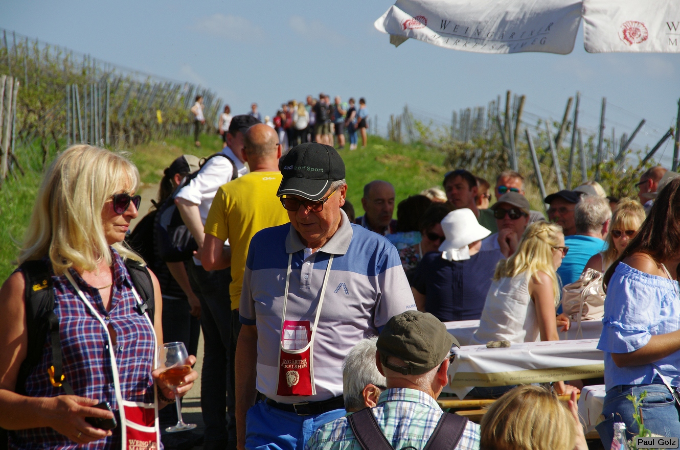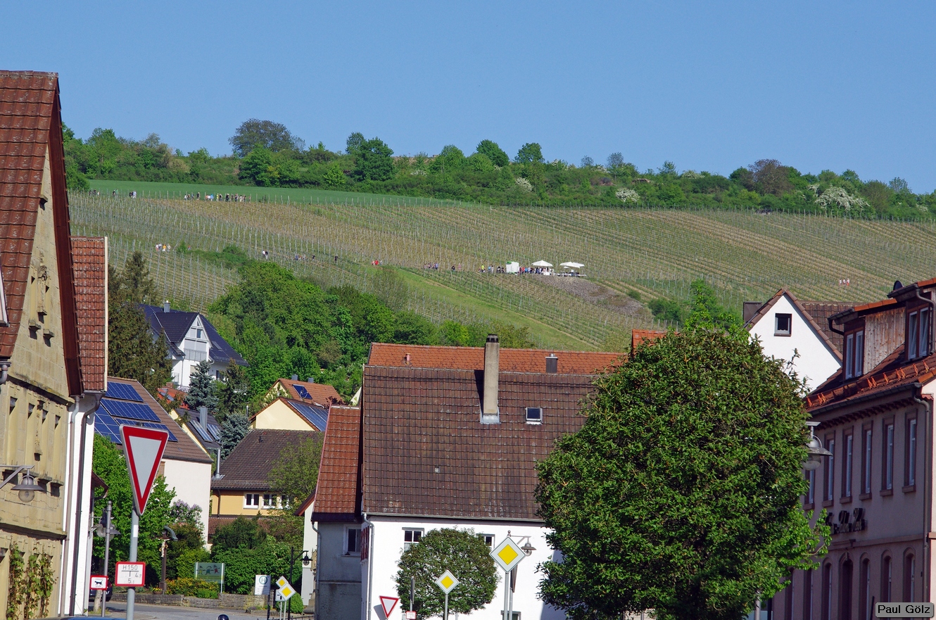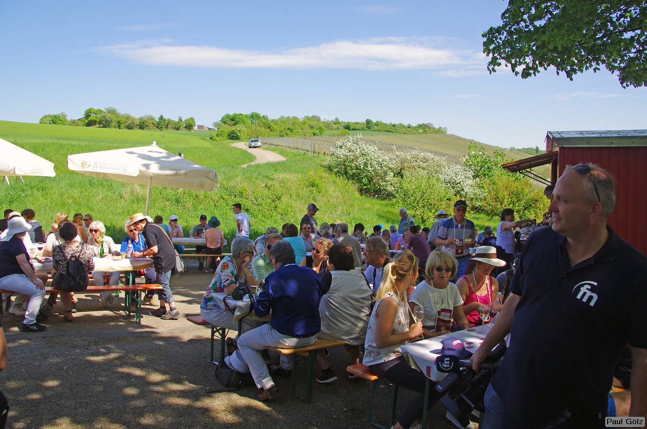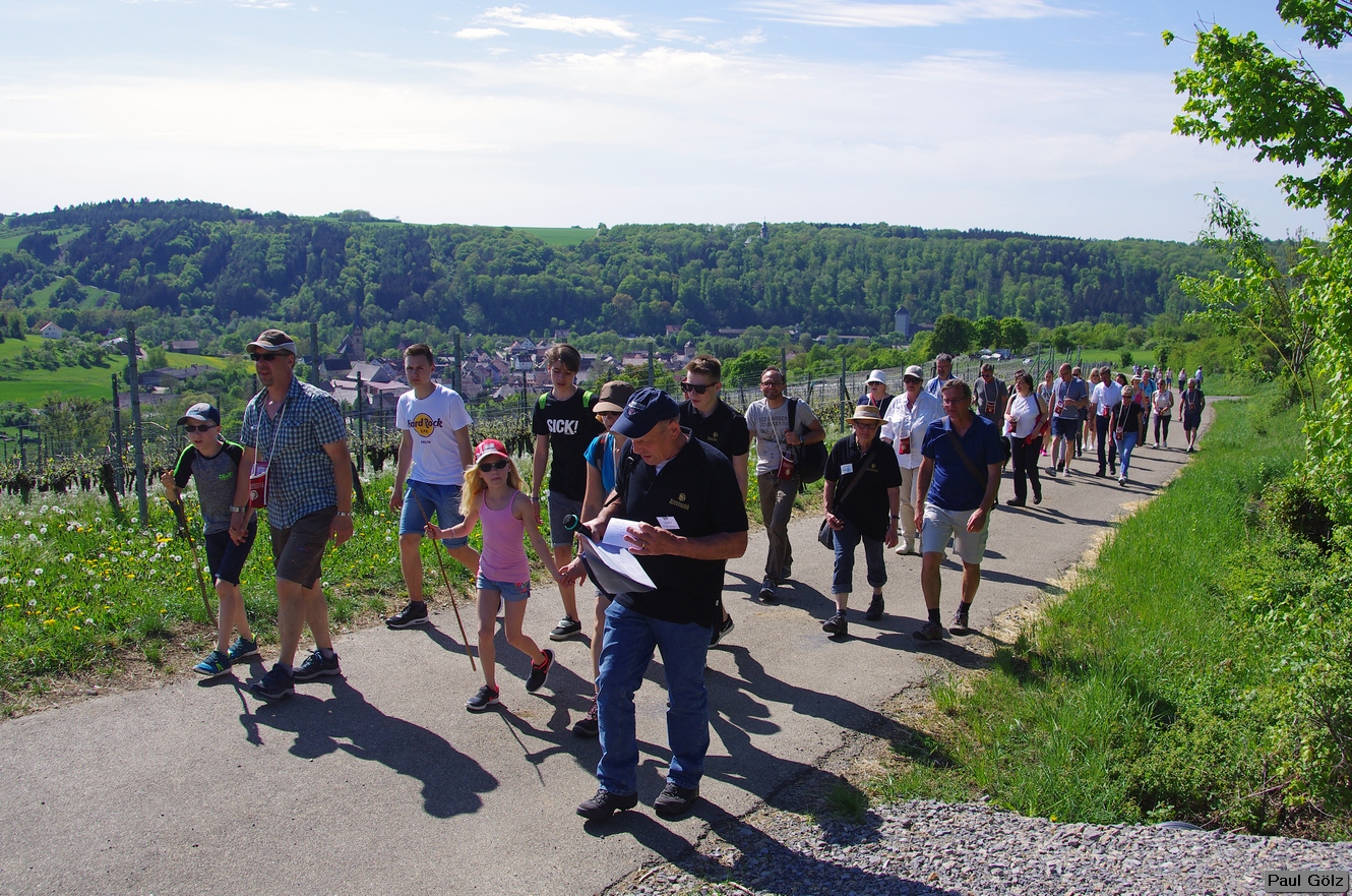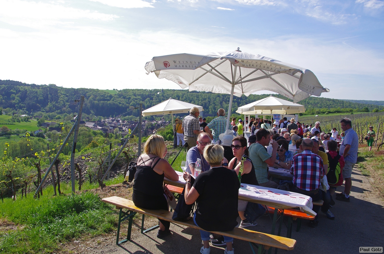Dabei erfuhren die Gäste Interessantes über die Weinbaugeschichte von Laudenbach, die verschiedenen Rebsorten (auch wie man sie erkennt) und die Arbeiten im Laufe eines Jahres wie Rebschnitt, Anbinden oder Schädlingsbekämpfung. Geschäftsführender Vorstand Michael Schmitt von der WG Markelsheim ergänzte, dass ein Hektar aus rund 4500 Rebstöcken besteht und ein Rebstock wiederum etwa drei Flaschen à 0,75 l Wein hervorbringt. An drei Ständen wurden unter großen Sonnenschirmen heimische Weine der WG Markelsheim angeboten. Jeder Teilnehmer konnte unter dem Werbeslogan „Von der Sonne verwöhnt“ bei sommerlichen Temperaturen auf der Runde die typischen Weine inmitten der herrlichen Natur genießen. Zum Abschluss der Wanderung stärkten sich die doch etwas erschöpften Wanderer mit einer Winzervesper im Schlosshof oder im angrenzenden urigen Julius-Echter-Keller. Bereits am Vormittag fand die offizielle Begrüßung und der Eintrag ins Goldene Buch der Stadt Weikersheim der beiden renommierten Ehrengäste im Julius-Echter-Tank statt.