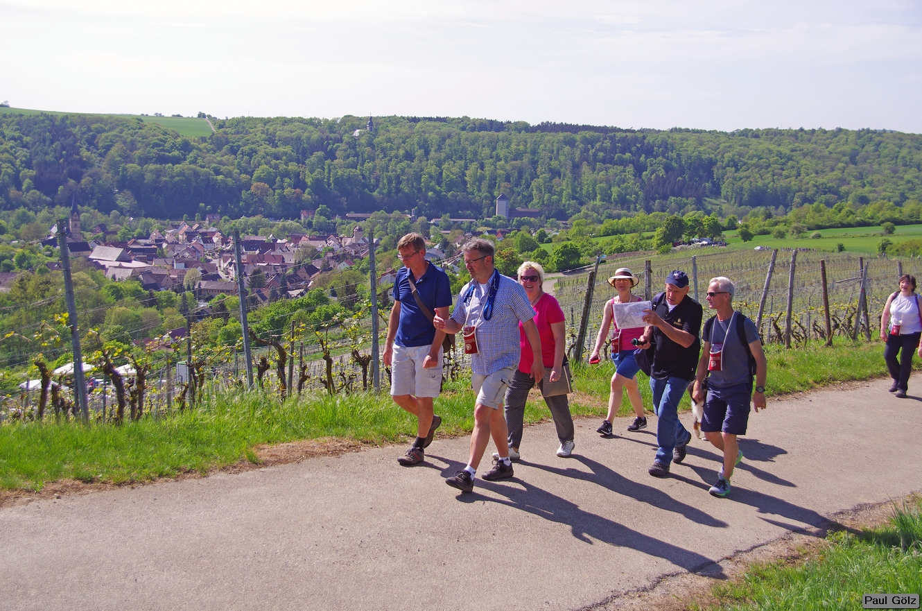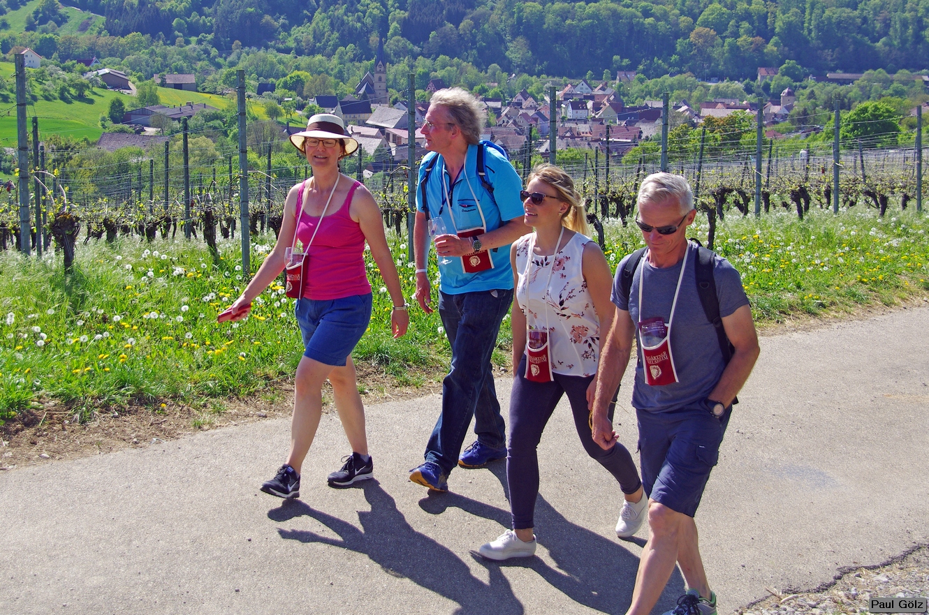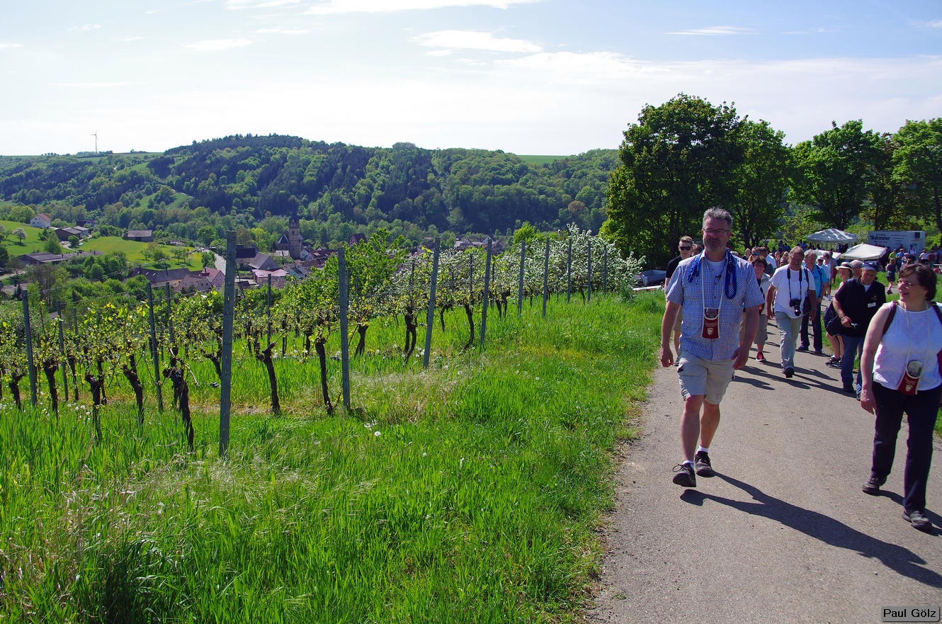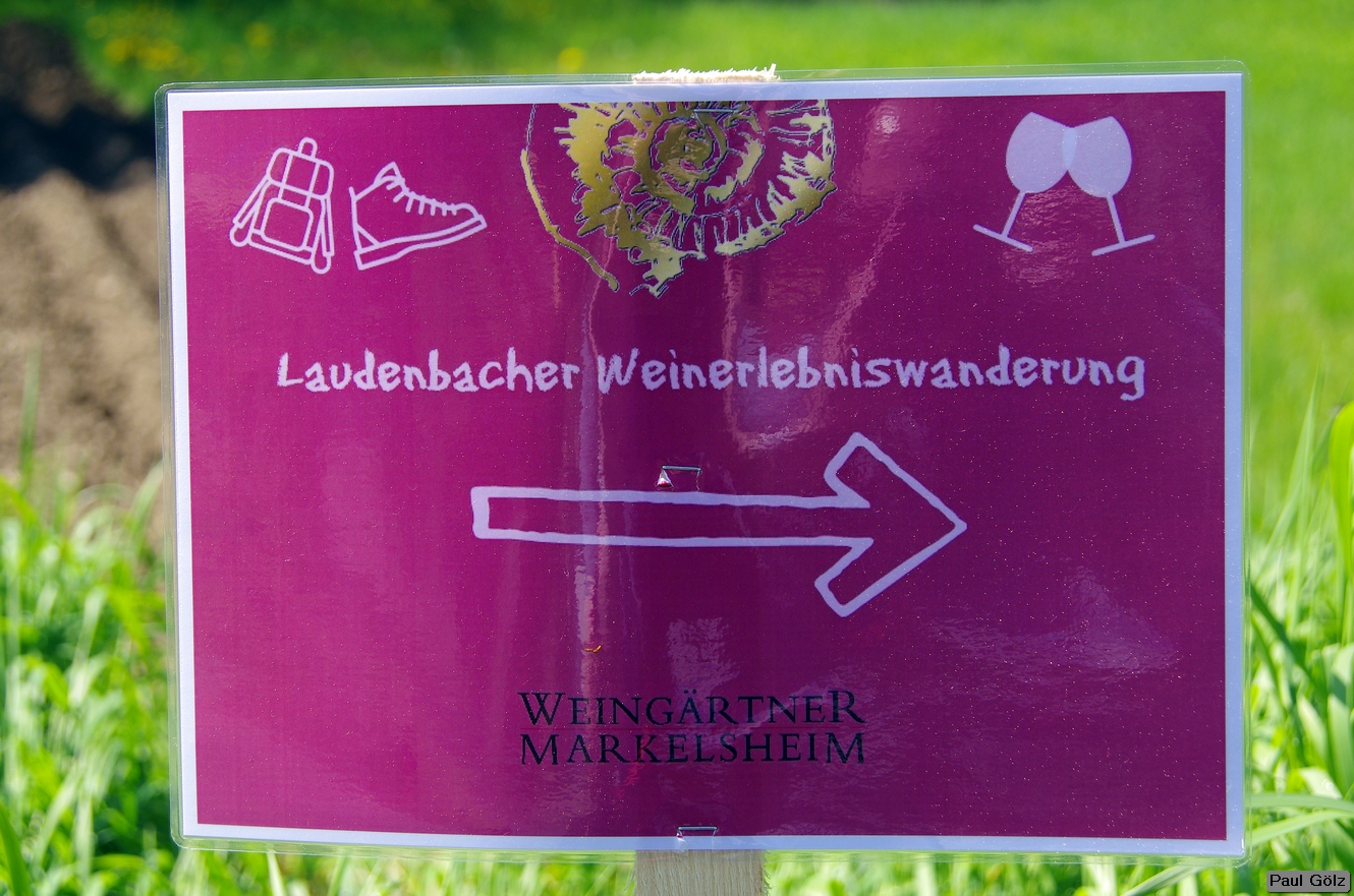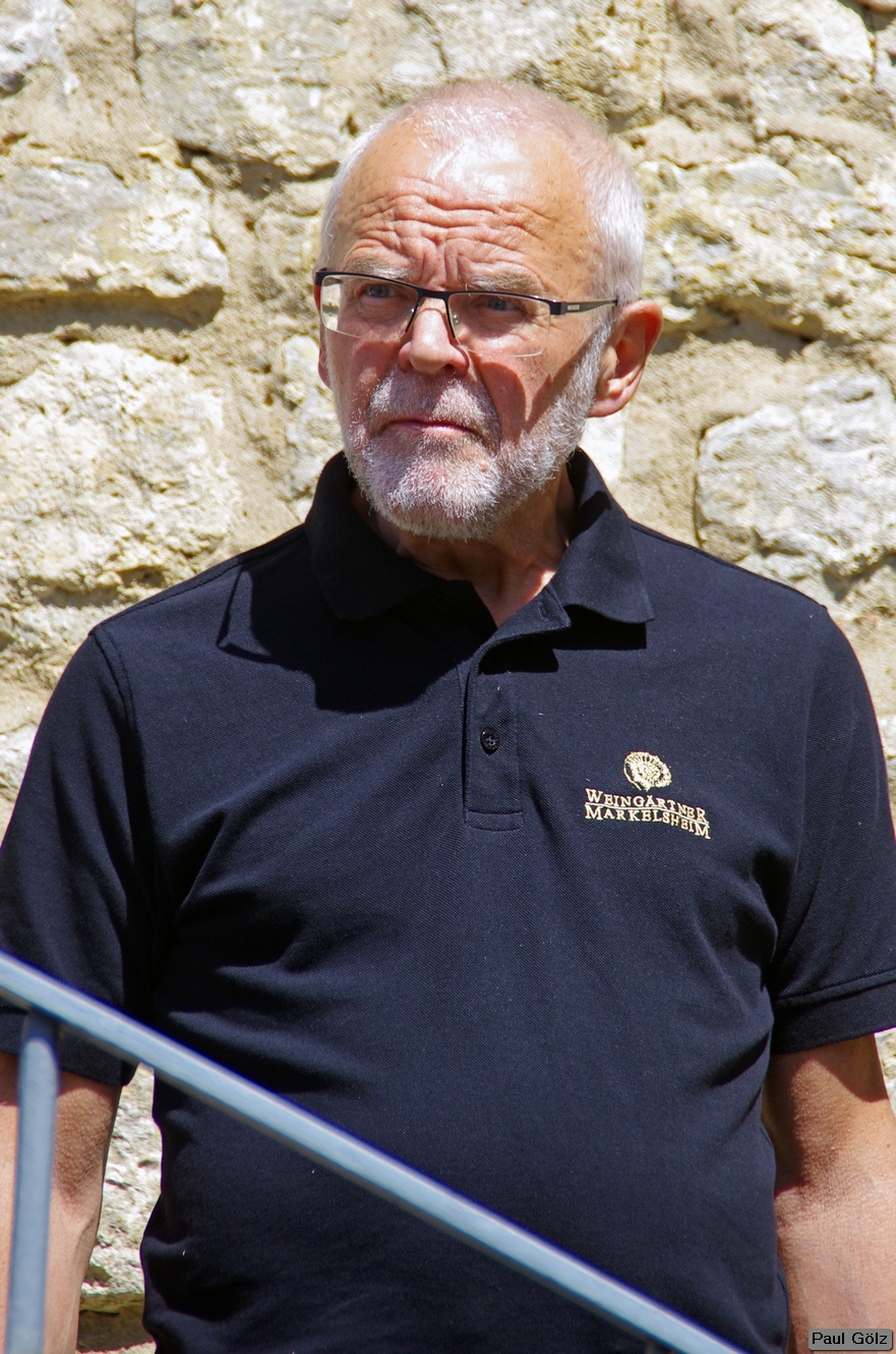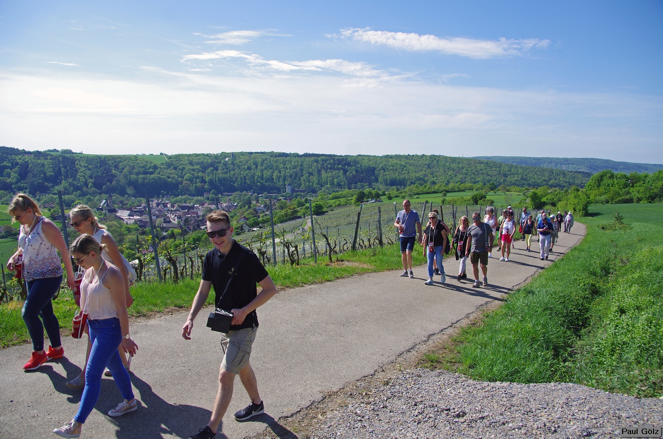 Dabei erfuhren die Gäste Interessantes über die Weinbaugeschichte von Laudenbach, die verschiedenen Rebsorten (auch wie man sie erkennt) und die Arbeiten im Laufe eines Jahres wie Rebschnitt, Anbinden oder Schädlingsbekämpfung. Geschäftsführender Vorstand Michael Schmitt von der WG Markelsheim ergänzte, dass ein Hektar aus rund 4500 Rebstöcken besteht und ein Rebstock wiederum etwa drei Flaschen à 0,75 l Wein hervorbringt. An drei Ständen wurden unter großen Sonnenschirmen heimische Weine der WG Markelsheim angeboten. Jeder Teilnehmer konnte unter dem Werbeslogan „Von der Sonne verwöhnt“ bei sommerlichen Temperaturen auf der Runde die typischen Weine inmitten der herrlichen Natur genießen. Zum Abschluss der Wanderung stärkten sich die doch etwas erschöpften Wanderer mit einer Winzervesper im Schlosshof oder im angrenzenden urigen Julius-Echter-Keller. Bereits am Vormittag fand die offizielle Begrüßung und der Eintrag ins Goldene Buch der Stadt Weikersheim der beiden renommierten Ehrengäste im Julius-Echter-Tank statt.