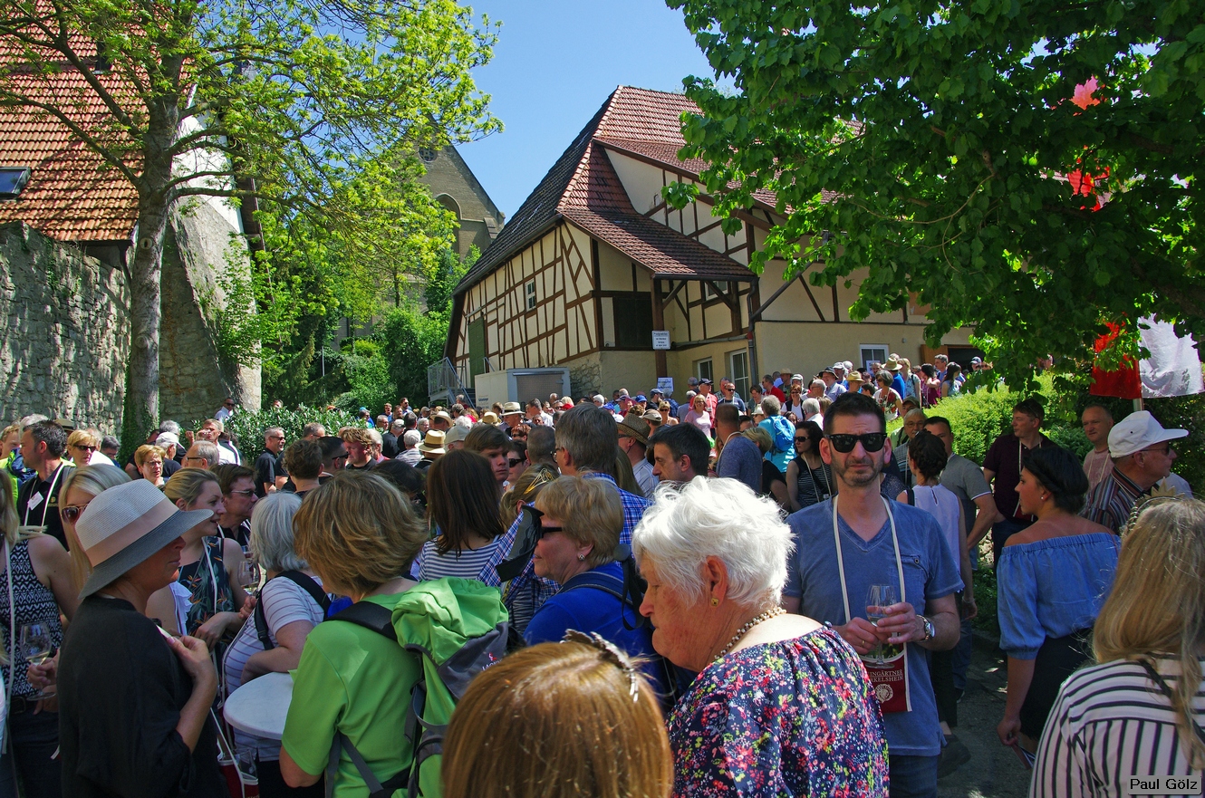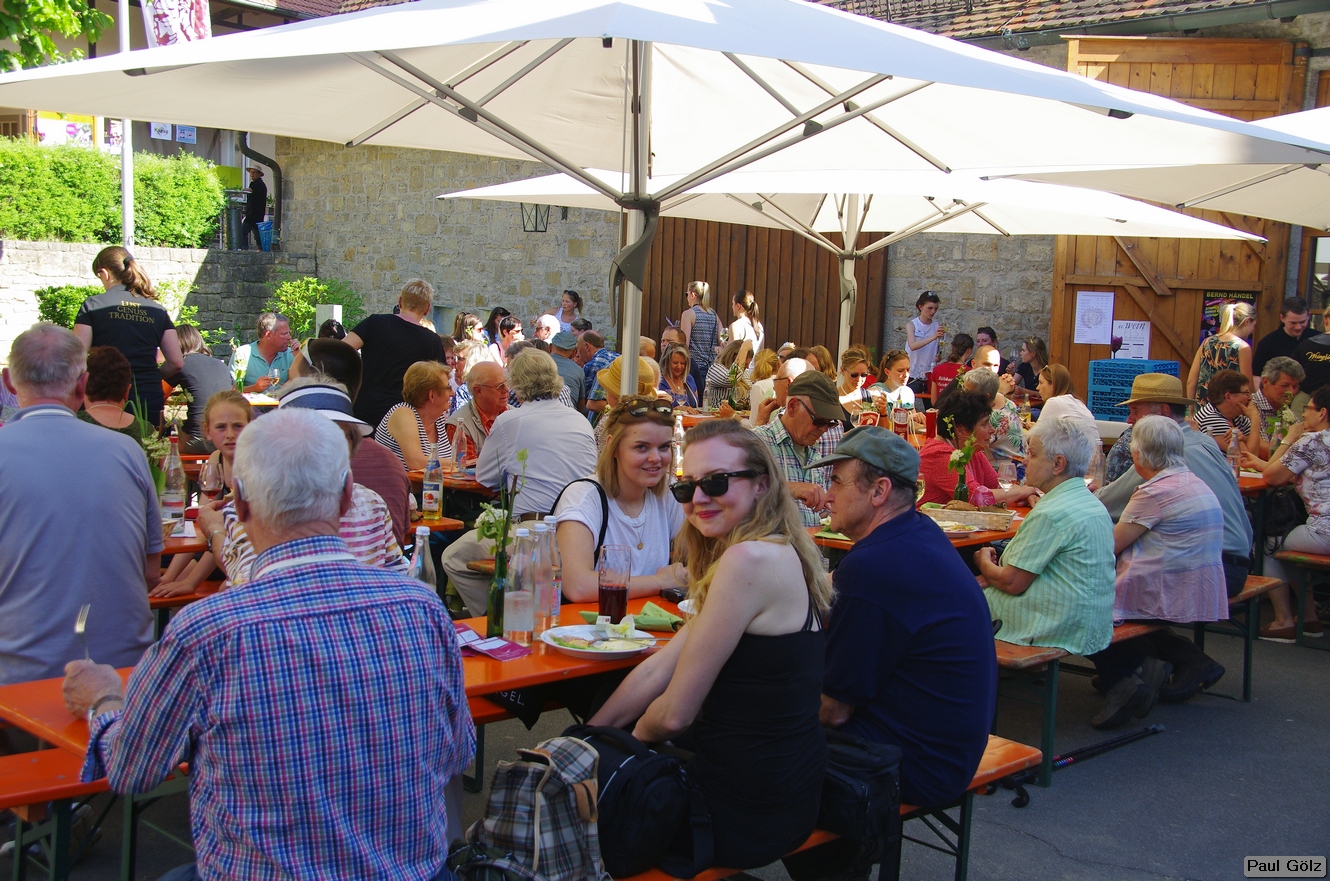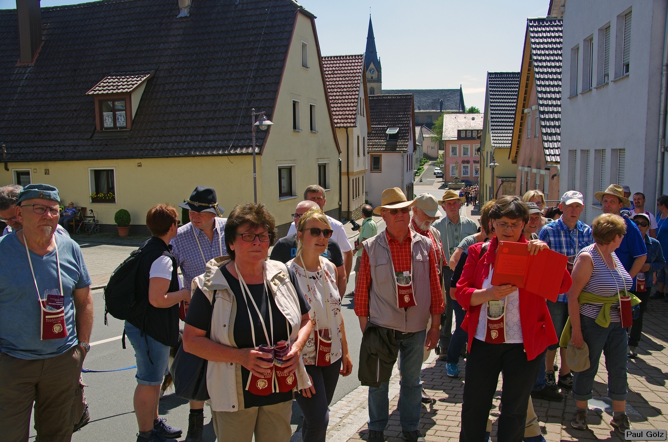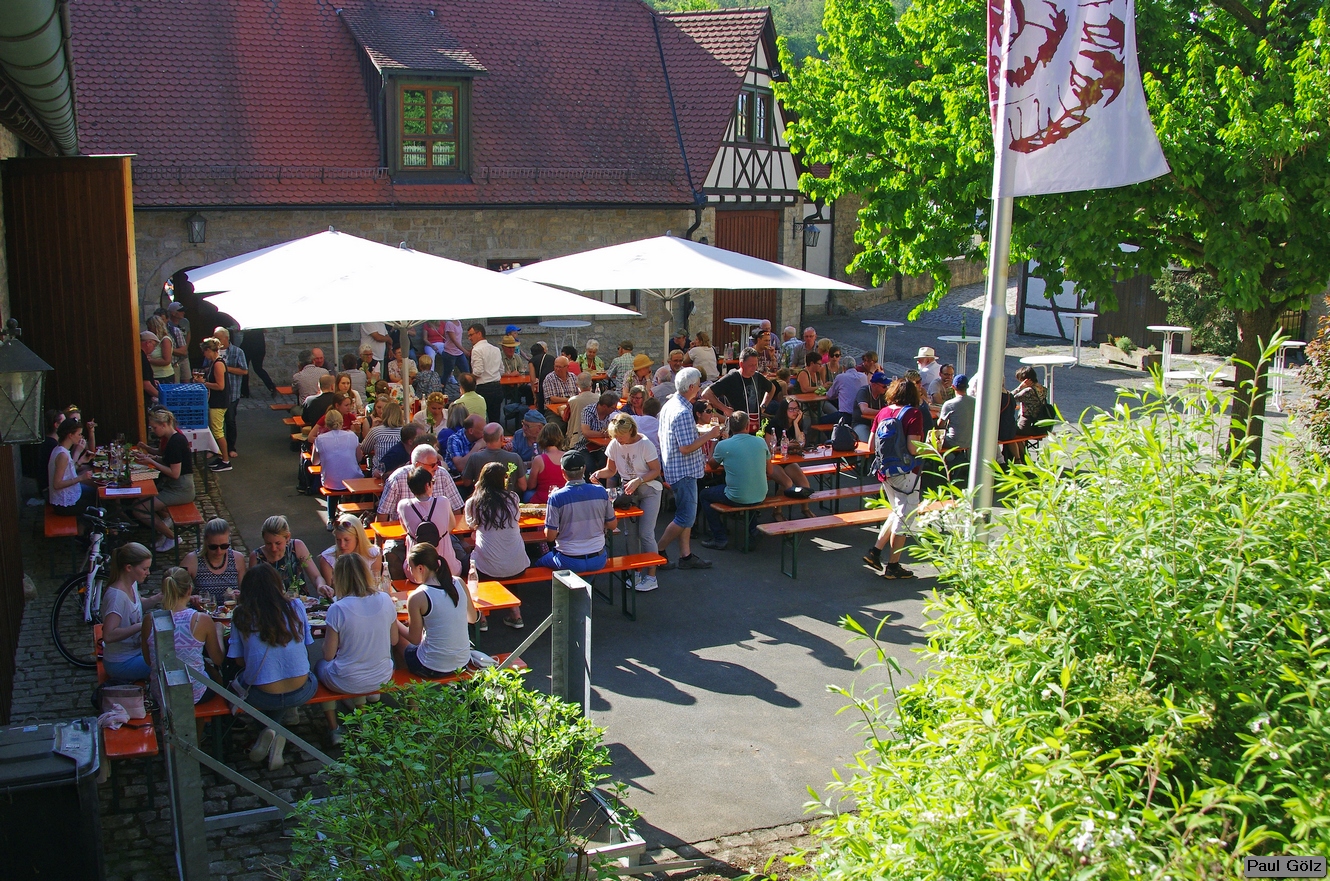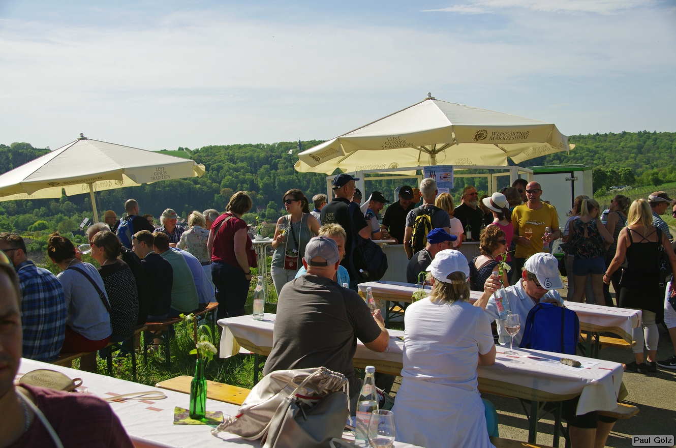Dabei erfuhren die Gäste Interessantes über die Weinbaugeschichte von Laudenbach, die verschiedenen Rebsorten (auch wie man sie erkennt) und die Arbeiten im Laufe eines Jahres wie Rebschnitt, Anbinden oder Schädlingsbekämpfung. Geschäftsführender Vorstand Michael Schmitt von der WG Markelsheim ergänzte, dass ein Hektar aus rund 4500 Rebstöcken besteht und ein Rebstock wiederum etwa drei Flaschen à 0,75 l Wein hervorbringt. An drei Ständen wurden unter großen Sonnenschirmen heimische Weine der WG Markelsheim angeboten. Jeder Teilnehmer konnte unter dem Werbeslogan „Von der Sonne verwöhnt“ bei sommerlichen Temperaturen auf der Runde die typischen Weine inmitten der herrlichen Natur genießen. Zum Abschluss der Wanderung stärkten sich die doch etwas erschöpften Wanderer mit einer Winzervesper im Schlosshof oder im angrenzenden urigen Julius-Echter-Keller. Bereits am Vormittag fand die offizielle Begrüßung und der Eintrag ins Goldene Buch der Stadt Weikersheim der beiden renommierten Ehrengäste im Julius-Echter-Tank statt.