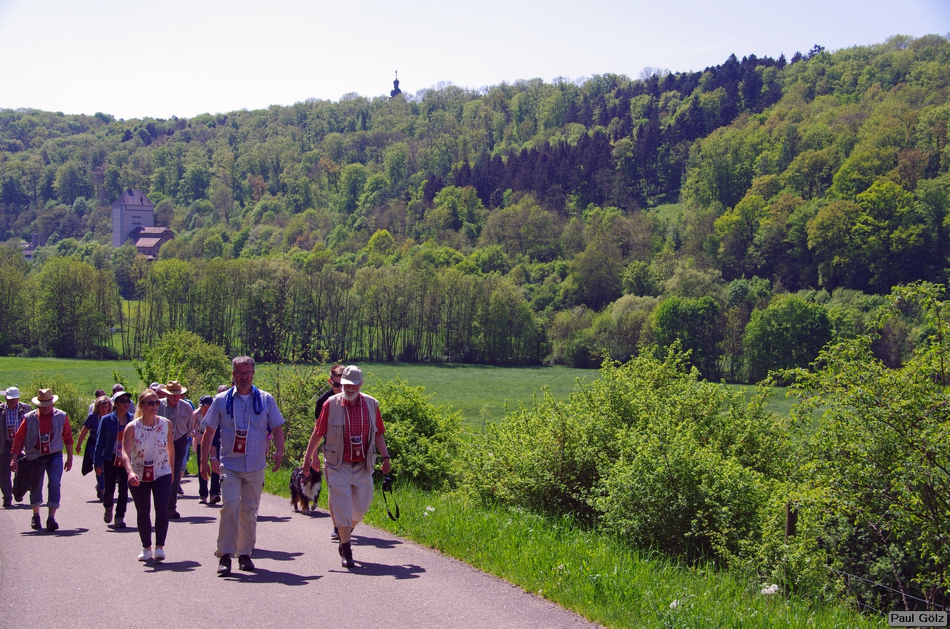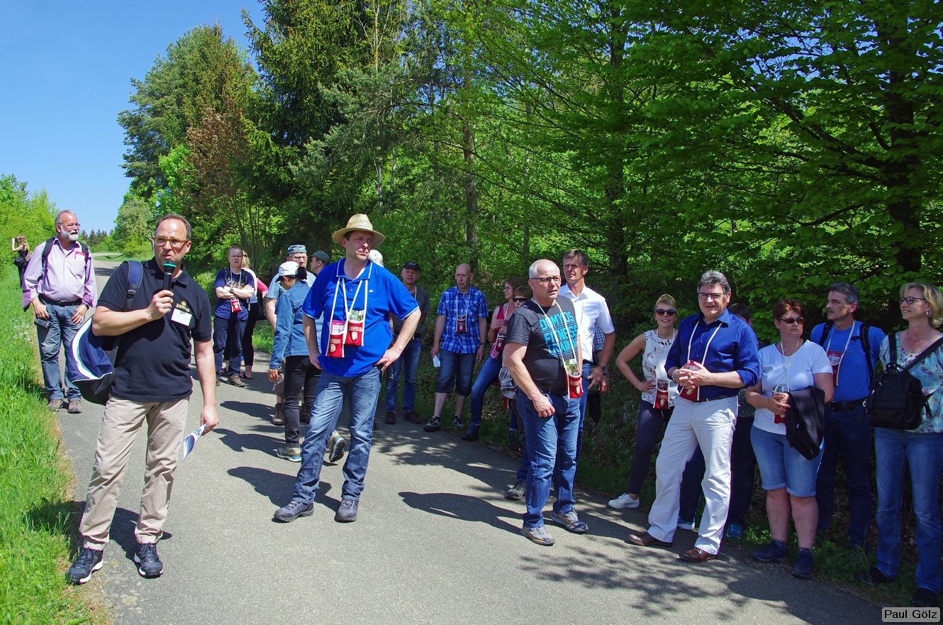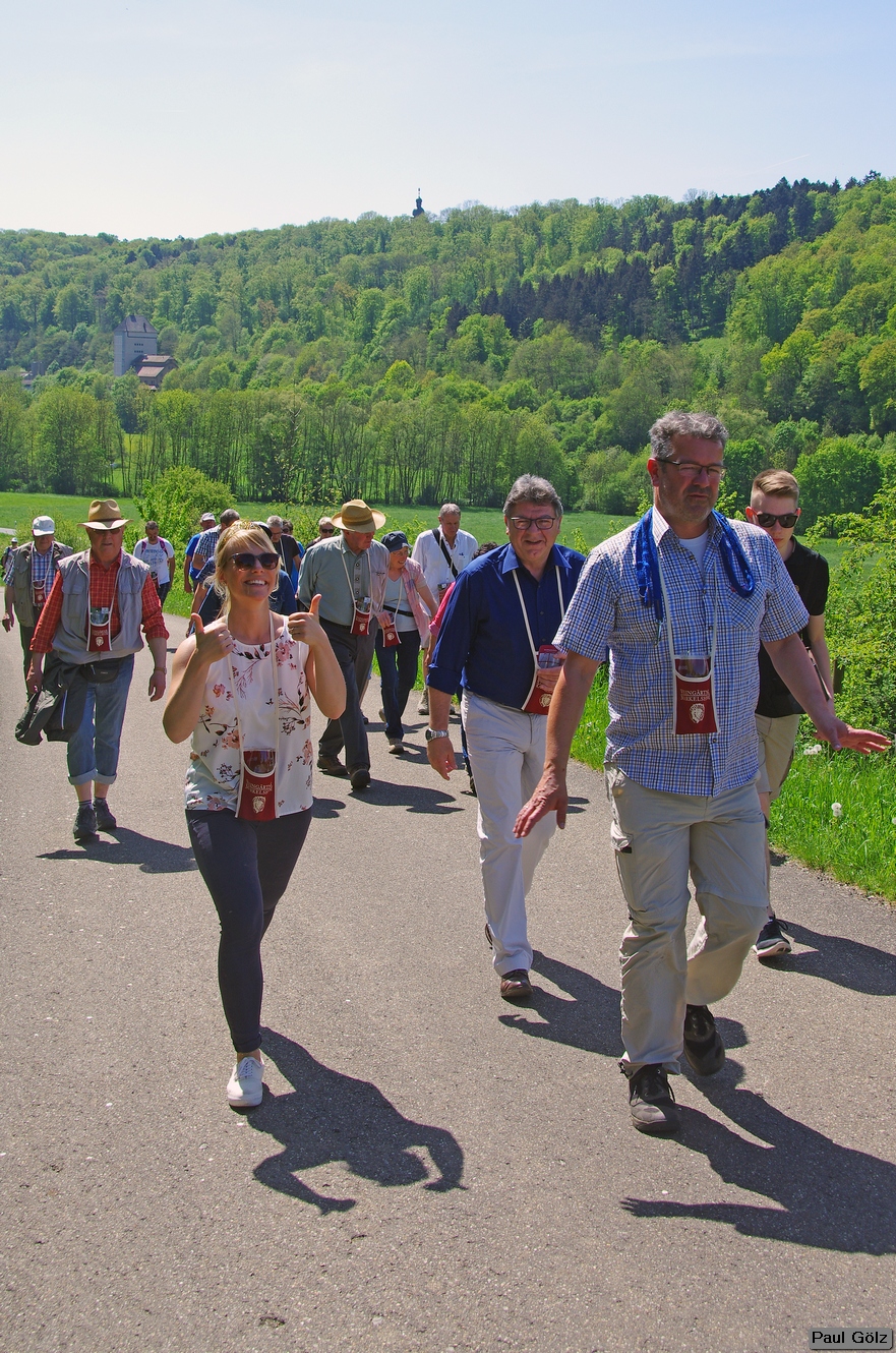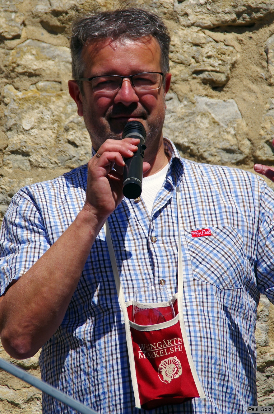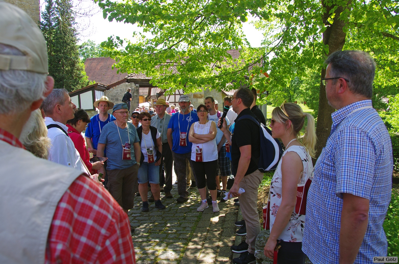 Dabei erfuhren die Gäste Interessantes über die Weinbaugeschichte von Laudenbach, die verschiedenen Rebsorten (auch wie man sie erkennt) und die Arbeiten im Laufe eines Jahres wie Rebschnitt, Anbinden oder Schädlingsbekämpfung. Geschäftsführender Vorstand Michael Schmitt von der WG Markelsheim ergänzte, dass ein Hektar aus rund 4500 Rebstöcken besteht und ein Rebstock wiederum etwa drei Flaschen à 0,75 l Wein hervorbringt. An drei Ständen wurden unter großen Sonnenschirmen heimische Weine der WG Markelsheim angeboten. Jeder Teilnehmer konnte unter dem Werbeslogan „Von der Sonne verwöhnt“ bei sommerlichen Temperaturen auf der Runde die typischen Weine inmitten der herrlichen Natur genießen. Zum Abschluss der Wanderung stärkten sich die doch etwas erschöpften Wanderer mit einer Winzervesper im Schlosshof oder im angrenzenden urigen Julius-Echter-Keller. Bereits am Vormittag fand die offizielle Begrüßung und der Eintrag ins Goldene Buch der Stadt Weikersheim der beiden renommierten Ehrengäste im Julius-Echter-Tank statt.
