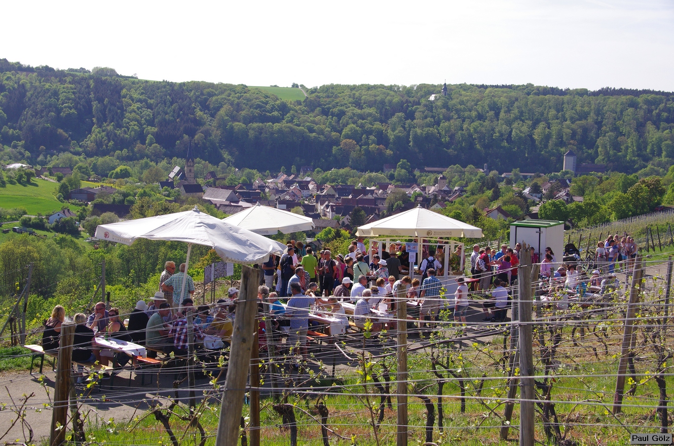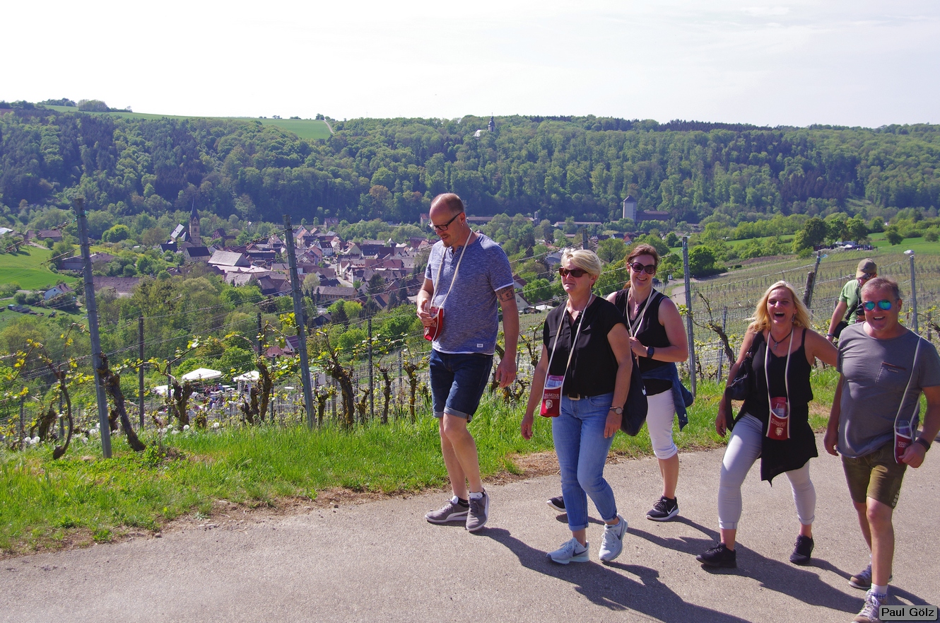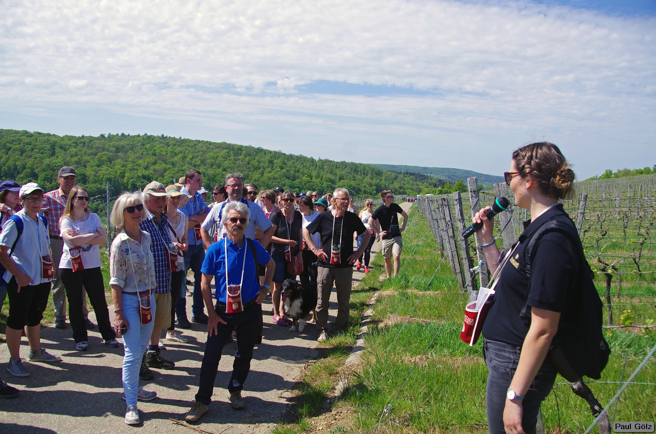 Knapp über 400 Weingäste hatten sich an der Treppe des Laudenbacher Schlosses eingefunden, um sich nach der musikalischen Begrüßung des Männergesangvereins Laudenbach sowie durch Andrea Büttner vom Organisationsteam und Ortsvorsteher Martin Rüttler auf die gut sechs Kilometer lange Wanderung zu machen. 13 örtliche Führer führten die Gruppen in einem Rundgang durch die Weinberglagen Ghäuberg und Schafsteige.